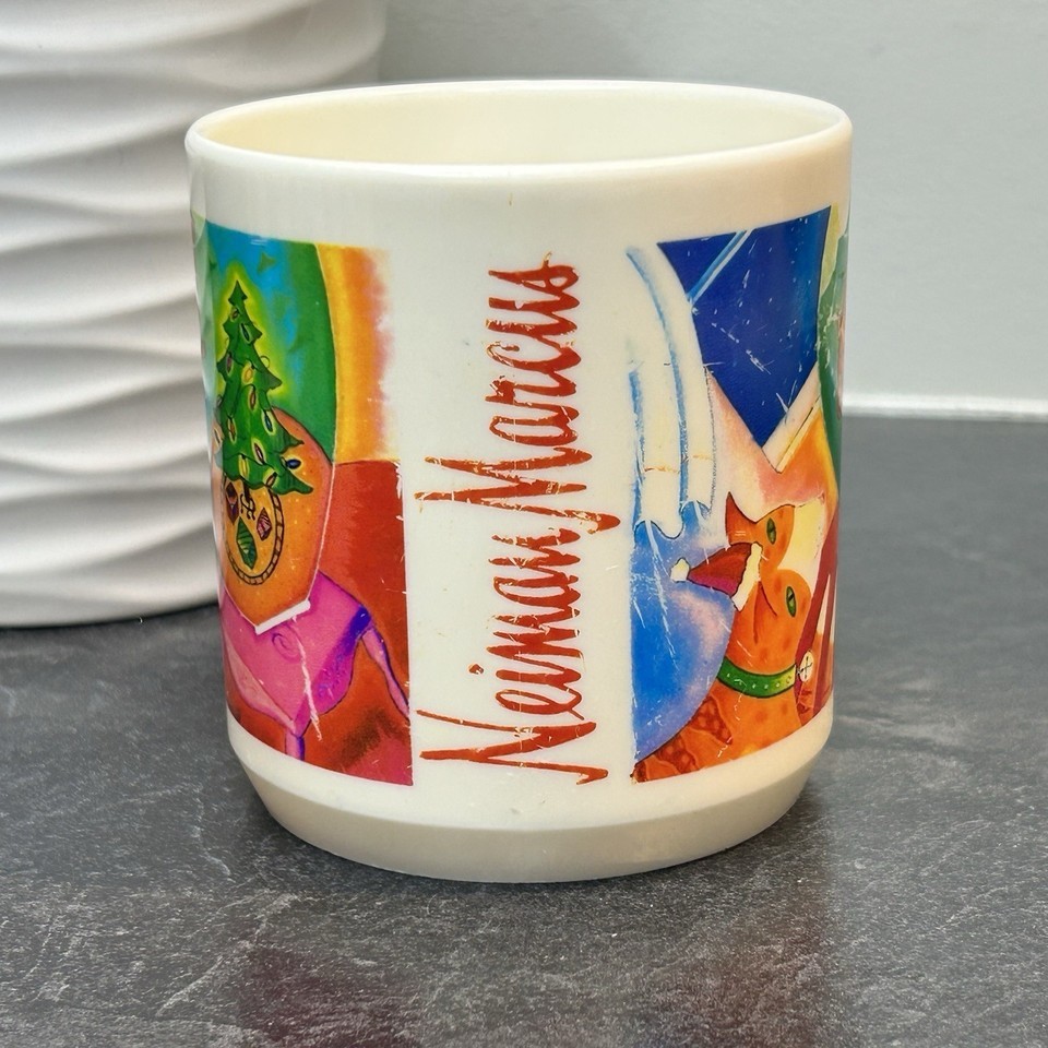 Vintage Neiman Marcus Christmas Cat & Fish Bowl Plastic Coffee Mug Cup 3.25”