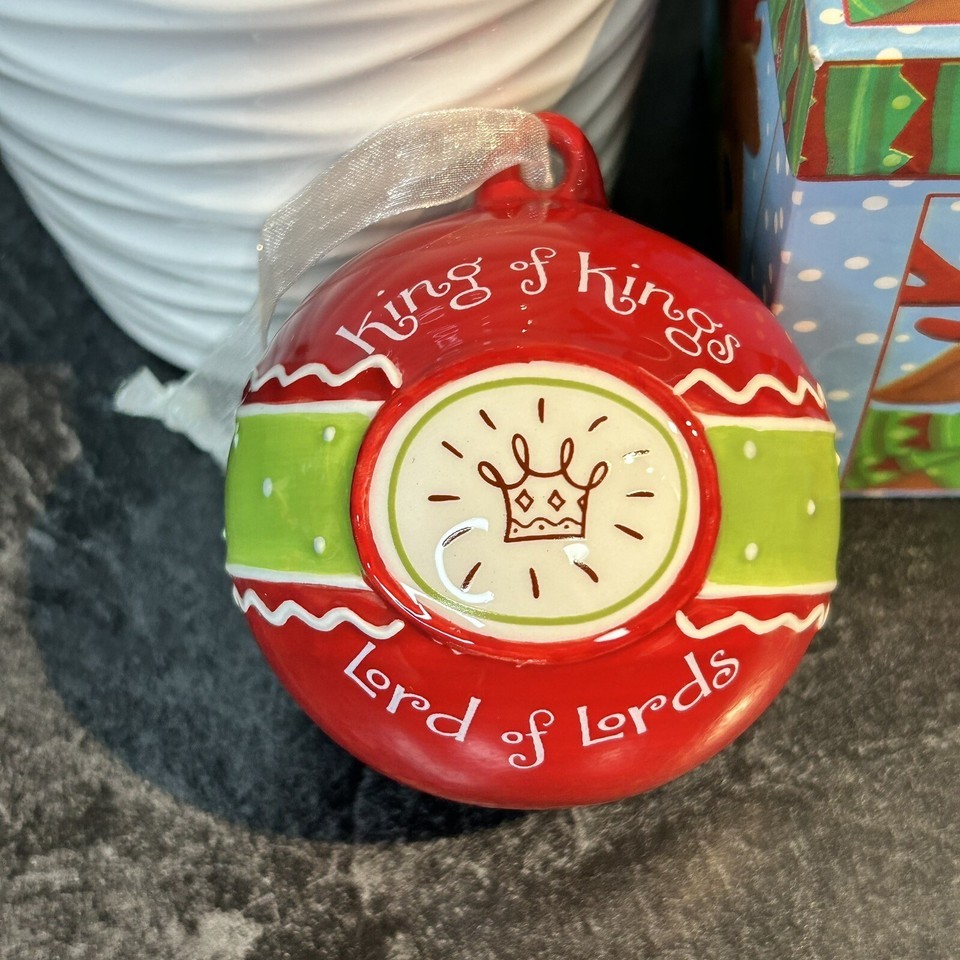 Vtg 3” Red Crimson Lord Of Lords Christian Scripture Christmas Ornament Ball