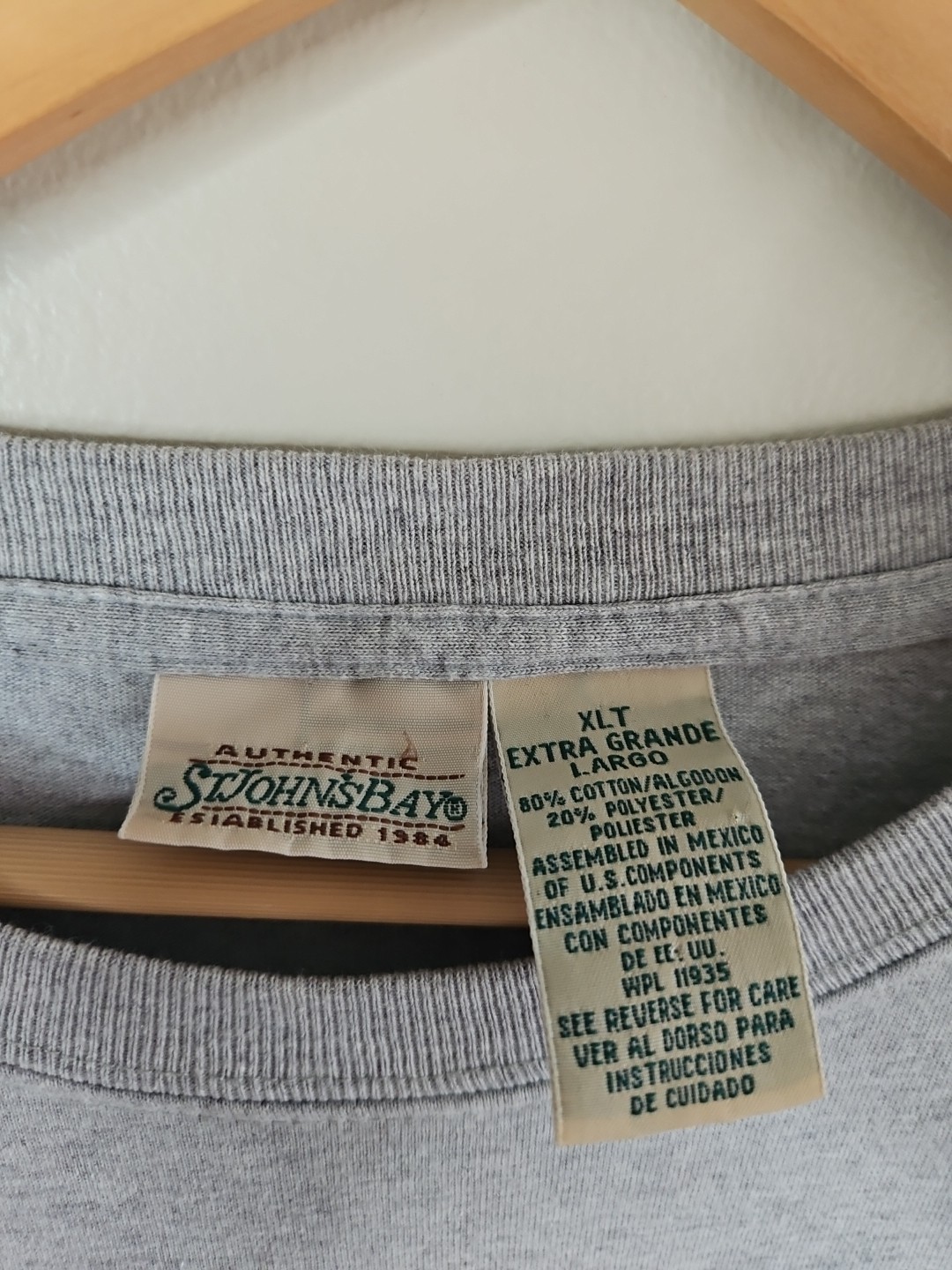 Color is off-white/gray. Tag suggests to me it is from the 90s. Size XLT, 80% cotton and 20% polyester. Shirt has a pocket.