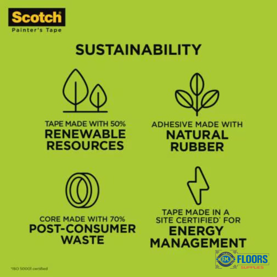1-Roll of 1.88? x 60 Yds 3M 2060-36AP Scotch Green Rough Surface Painter?s Tape for Hard?to?Stick Surfaces, Single Wrap Description: Scotch Rough Surface Painter?s Tape has a very strong adhesive designed for performance on rough, non-damageable surfaces. Use on brick, concrete, stucco, or rough wood for the protection you need to get the job done. Scotch Rough Surface Painter?s Tape is recommended for use with or on lacquer coatings. This tape holds to surfaces for up to 5 days and then removes easily without leaving any sticky residue behind. Will not lift, curl or transfer adhesive with most lacquers; offers high adhesion on rough, uneven or hard-to-stick surfaces. Features USE-ON SURFACES: Designed for use on concrete, brick, stucco, and rough wood CLEAN REMOVAL: 5-day interior and 3-day exterior clean removal leaves behind no damage or sticky residue ADHESIVE LEVEL: Very strong RECOMMENDED FOR: Use with or on lacquer coatings PERFORMANCE: Bonds aggressively, yet has a smooth unwind SUSTAINABILITY: Made from 5% renewable resources; Adhesive made with natural rubber; Tape made in a site certified for energy management (ISO 51 certified); Core made with 7% post-consumer waste APPLICATION TIPS: For great paint results make sure the surface is clean, dry, and dust-free so that the tape sticks properly. Next, apply the tape onto the surface while pressing down firmly as you go. And lastly, let the tape set for about 3 to 6 minutes before painting. REMOVAL TIPS: Wait until the paint is dry to the touch before removing the tape. Lift it up by slowly pulling it back on itself, then removing at a 45-degree angle. Make Model Manufacturer3M Brand Scotch UPC021200711343 Model #2060-36AP Technical Specifications Type: General Purpose Width: 36 mm Length: 55 m Thickness: 0.006 Inch Adhesive Material: Rubber Backing Material: Crepe Paper Tensile Strength: 24 lb/Inch Adhesion Strength: 34 oz/Inch Temperature Rating: 200 deg F Resists: Moisture and Solvent Size: 36MMx55M Tape Color: Green *THIS PRODUCT IS SOLD INDIVIDUALLY*
