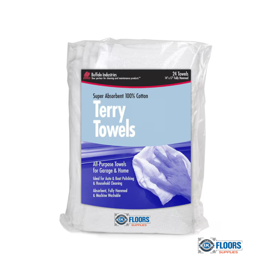 Terry Towels Super Absorbent 100% Cotton Terry All-purpose terry cloth towels. Very absorbent and ideal for all-purpose cleaning, polishing and detailing. Can be used around the home and garage. Machine washable. Size: 14? x 17? Fully-hemmedMaterial: 100% Cotton Multiple Product Uses HOUSEHOLD: Cleanup MaintenanceJANITORIAL: Cleaning WipingMARINE: Detailing CleanupINDUSTRIAL: Job Site Tool MaintenanceAUTOMOTIVE: Detailing Drying