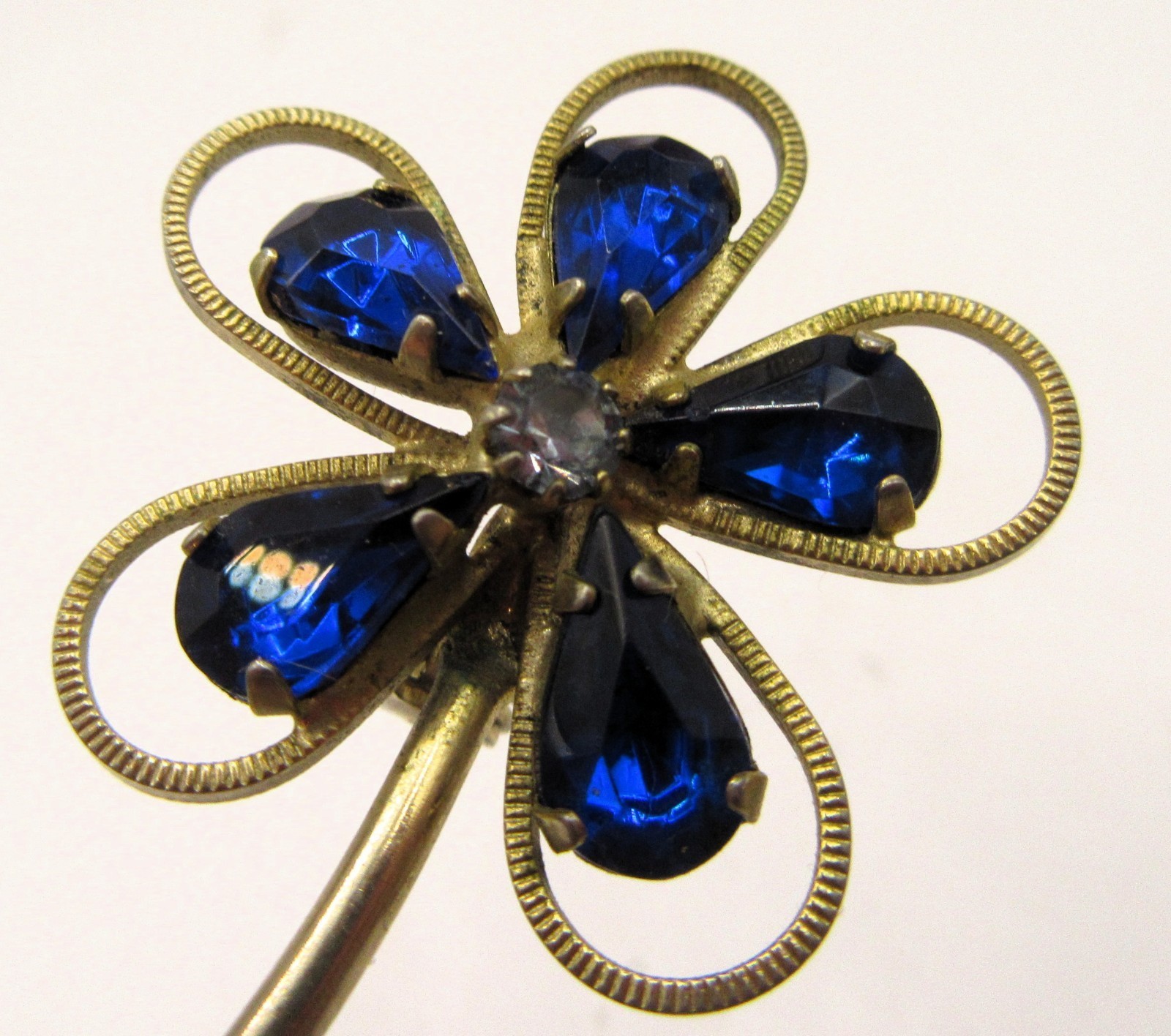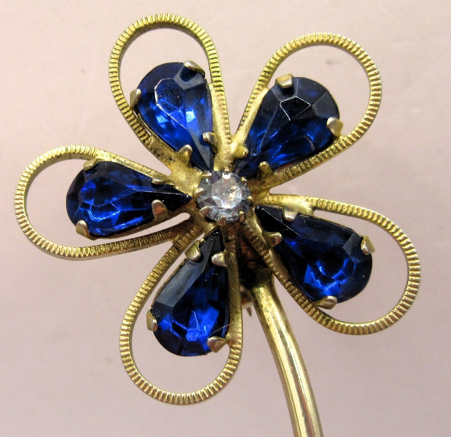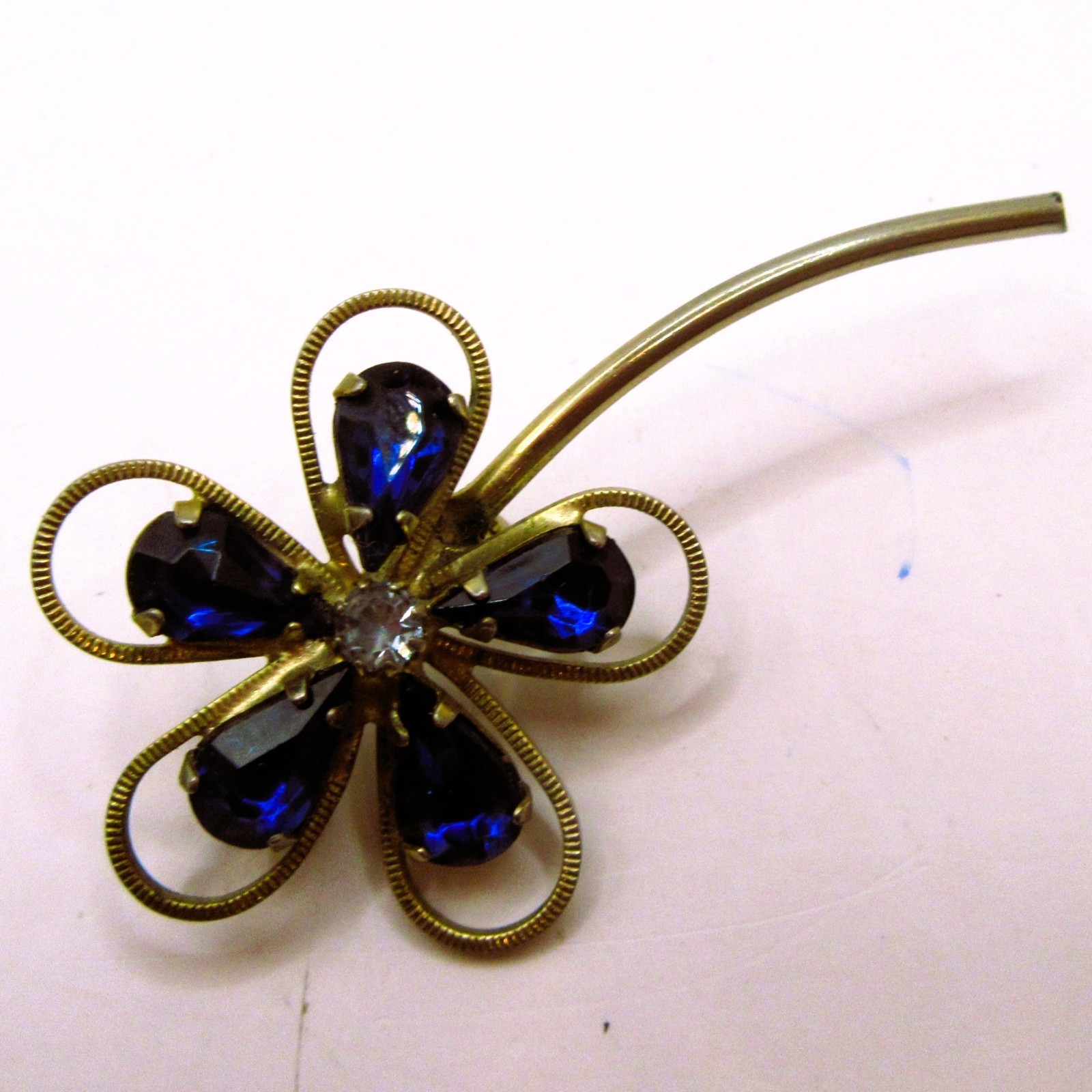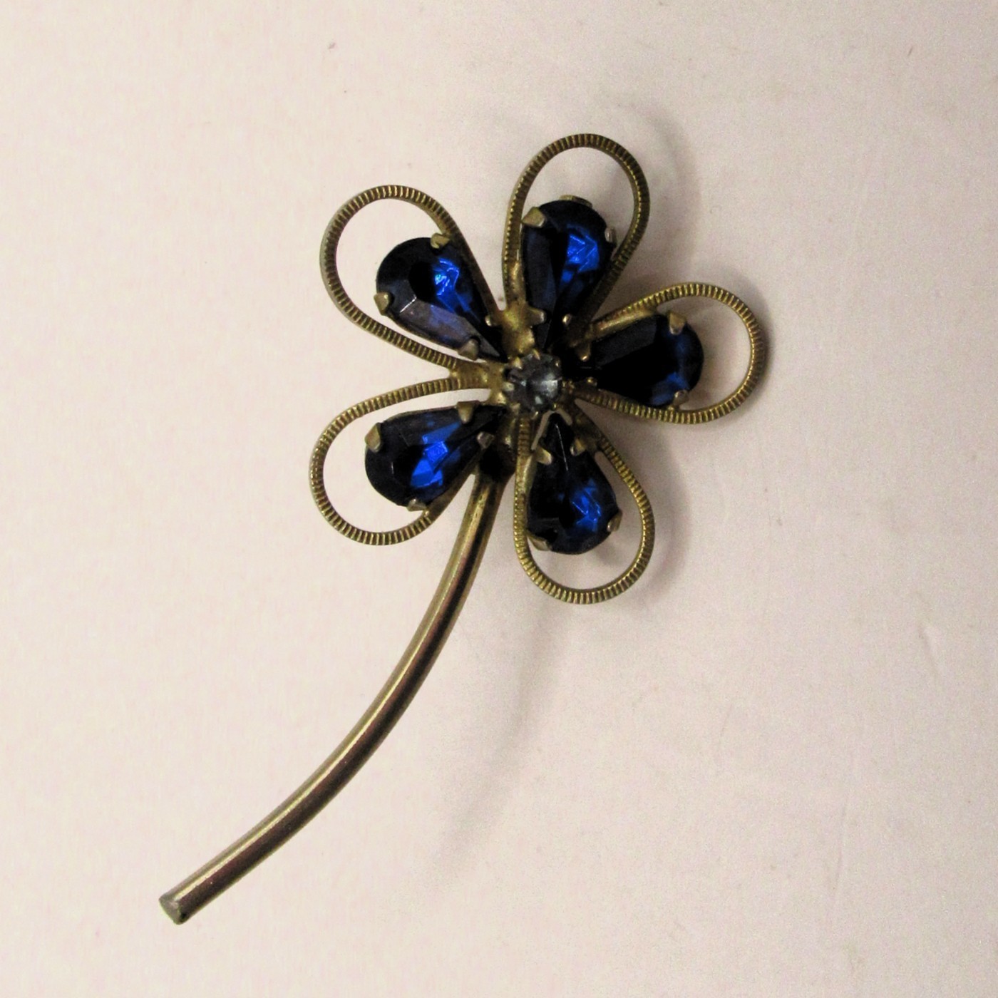 Vintage Blue Flower Brooch with Teardrop Rhinestones and Long Stem