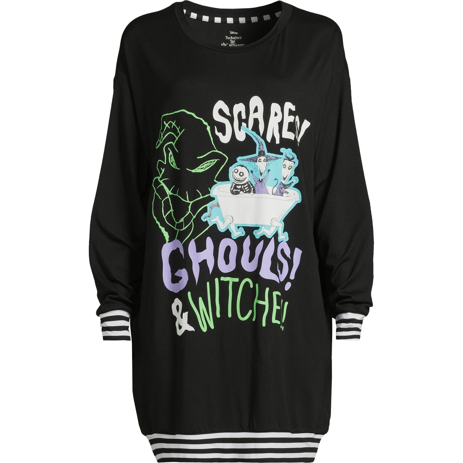 Get ready for scares, ghouls and witches and cozy up in spooky-cute style with this Women's The Nightmare Before Christmas Sleepshirt. Kick back and lounge. This pullover sleepshirt is an ideal pick for any fan or just for someone who appreciates a little comfort when the day is over. The lengthy silhouette keeps your night relaxed with super-soft fabric that?s easy on the skin.