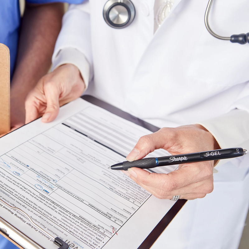 Sharpie S-Gel Gel Pens, Medium Point, 0.7mm, Assorted, 8 Count Sharpie gel pen with no smear, no bleed technology Intensely bold gel ink colors offer always vivid writing Contoured rubber grip for a comfortable writing experience Medium Point (0.7mm) Includes 8 Assorted Gel Ink Pens: 4 Black, 1 Blue, 1 Red, 1 Green, and 1 Purple
