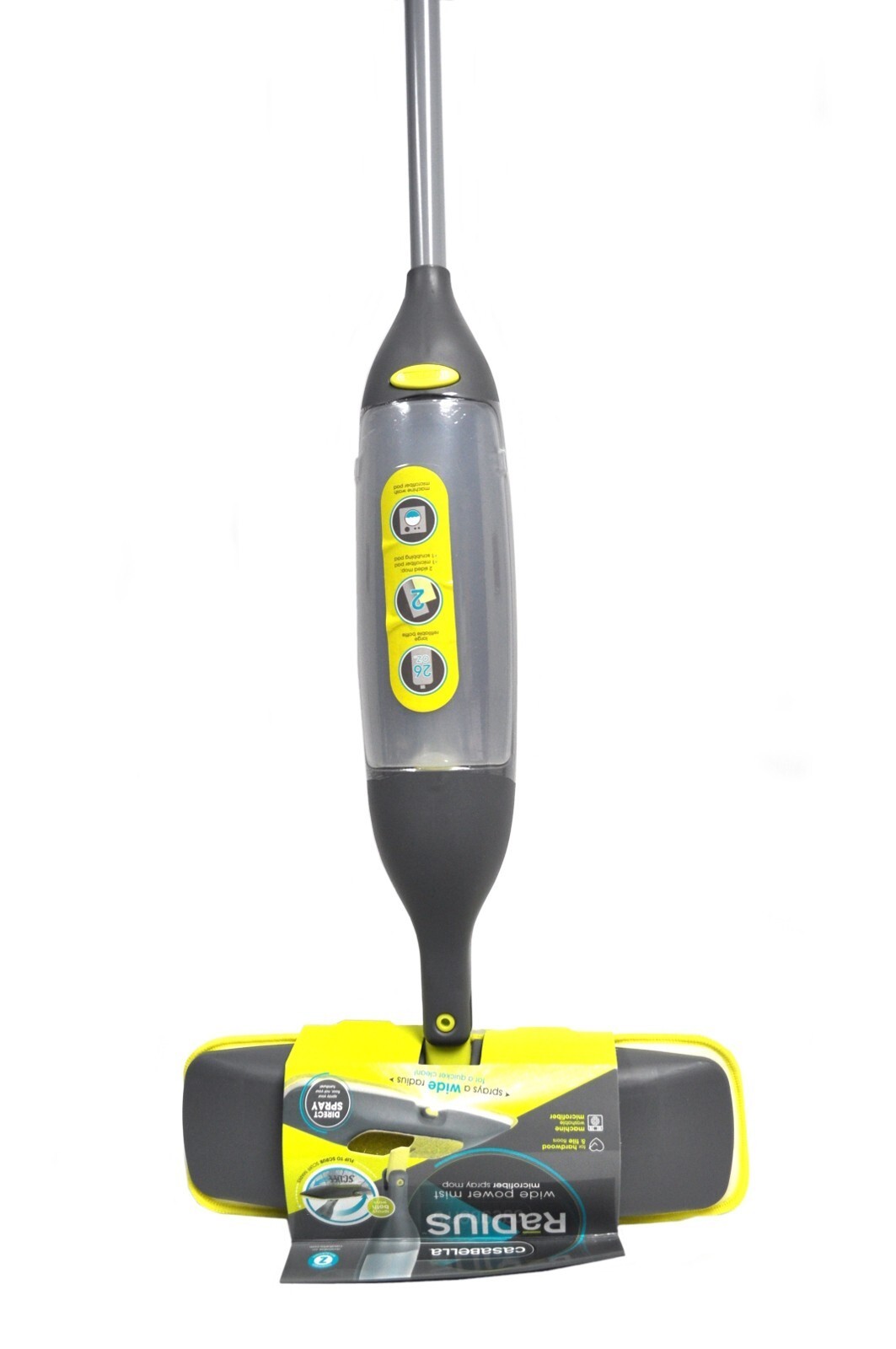 Casabella Wayclean Radius Spray Mop. Wide power mist microfiber spray mop. Sprays a wide radius for a quicker clean. Ideal for hardwood and tile floors. Direct spray you floor, not your furniture. Microfiber pad is machine washable. Features: Metal hanging hook. Rubber tip non-slide handle. Slim, lightweight design fits easily under furniture and saves storage space. Scrubbing pad (flip the mop over to scrub tough messes). Foam Grip. Easy push button release refillable container. 26 oz. refillable bottle to fill with our favorite floor cleaner. Low Profile direct spray nozzle when spraying for either side. Reusable microfiber pad. Approximate Dimensions: Length 49-1/2 inches. Width: 15 inches. DDD-88352