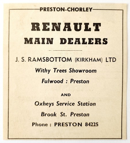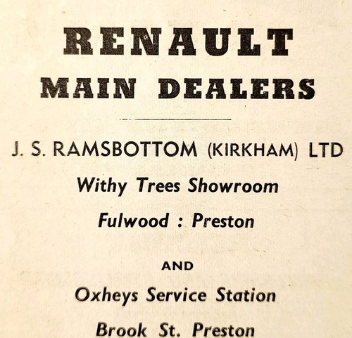 1954 Ramsbottom Renault Dealership Preston Advertisement Automobilia E89G1