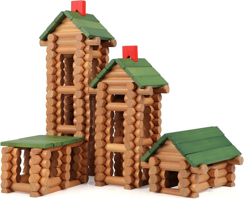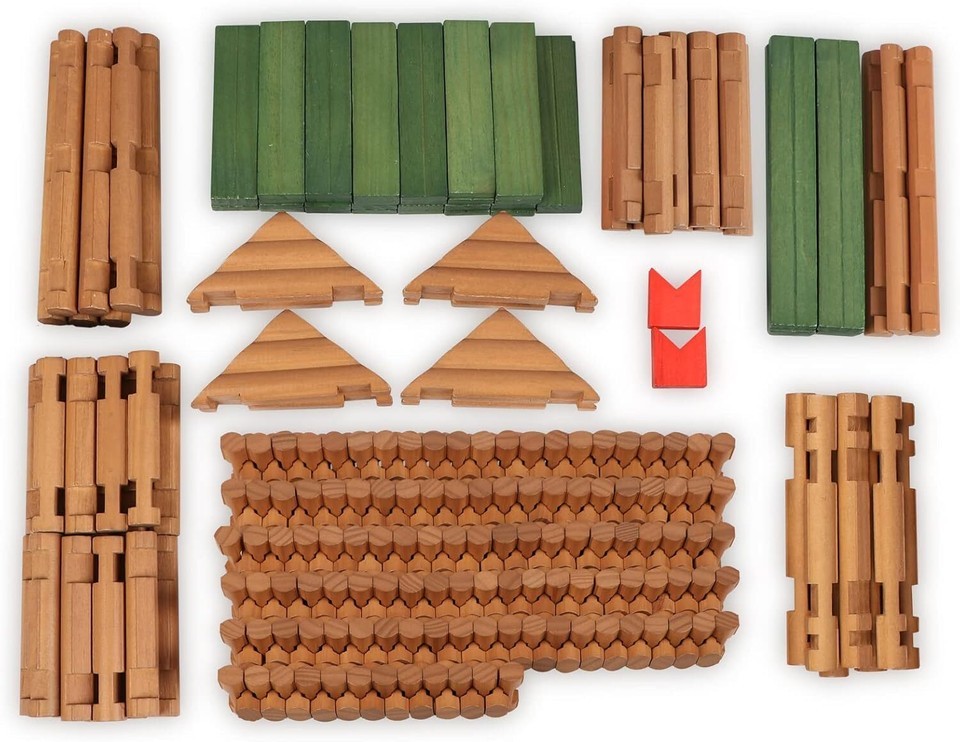 328 PIECES WOODEN LOGS SET: The building logs set was made from natural wood. Non-toxic paint, round edges with no sharp. Each log has indentations that allow it to connect with the others to build a school cabin, approved ASTM and CPSIA test. Safe for every child to build house and school. Opportunity to share with your Grandson one of your childhood tools