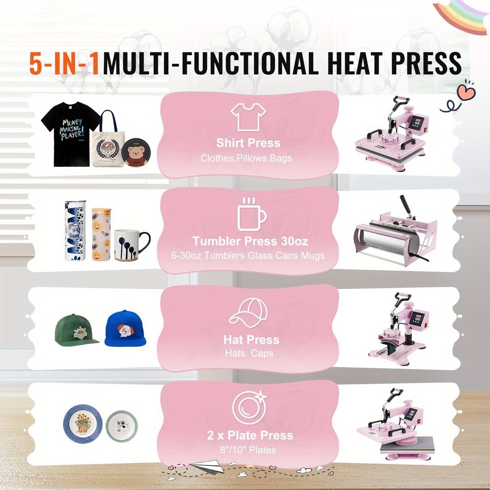 Turn creativity into business with this Happybuy 5-in-1 Heat Press Machine, featuring a large 12x15-inch platen and 30oz tumbler attachment ? perfect for customizing shirts, mugs, hats, plates, and more. With dual-tube heating for even temperature and a 360 swing-away design, it delivers professional, consistent transfers every time.