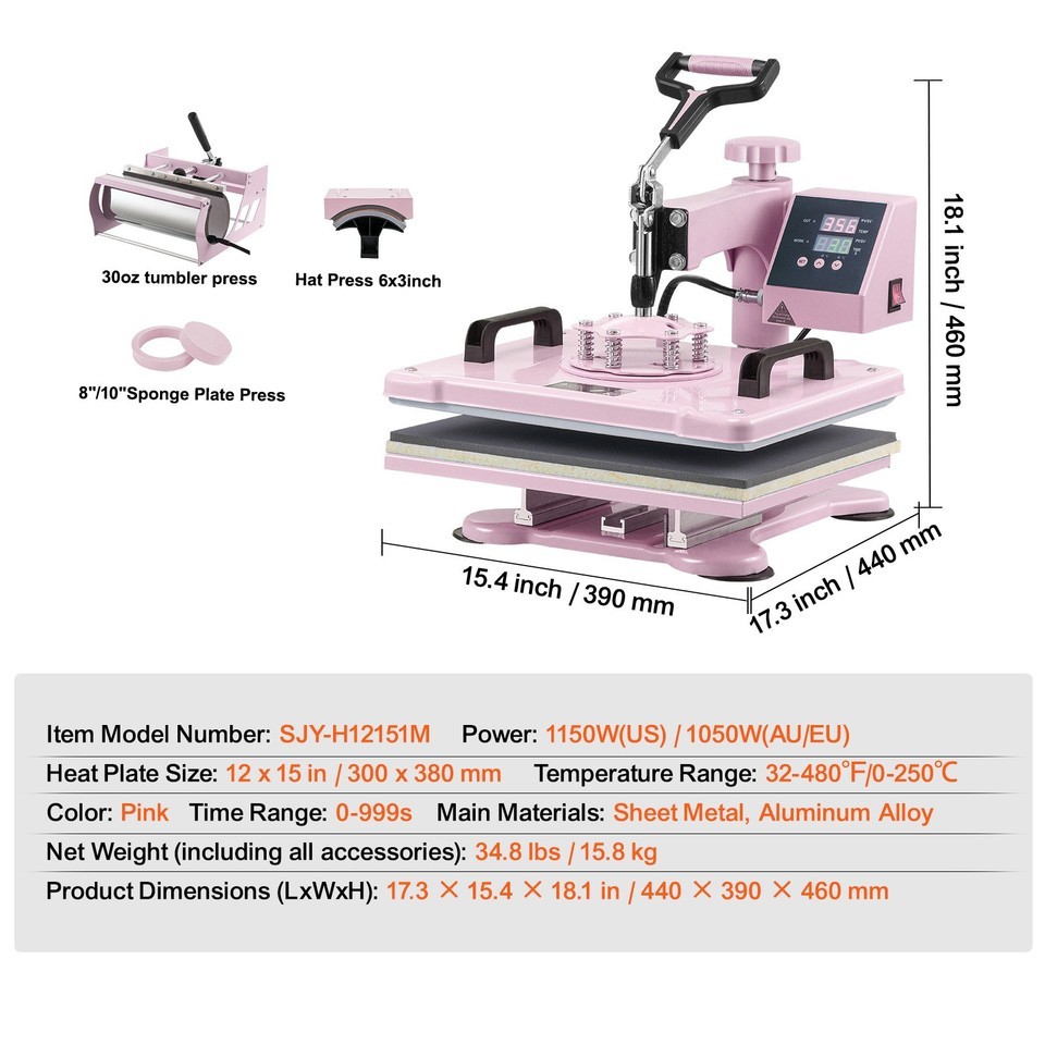 [5 in 1 Heat Press] Happybuy 5 in 1 Heat Press Machine, 12 x 15 inch, Digital Precise Control, 360 Swing Away T-Shirt Pressing, with 30 oz Tumbler Press, for T-Shirts/Mugs/Hats/Plates, Pink