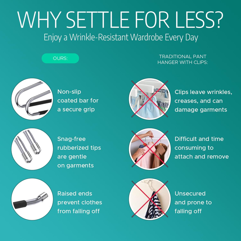 Built to Last- Our slacks hangers are made of durable metal and are designed as a jean hanger or hangers for trousers.