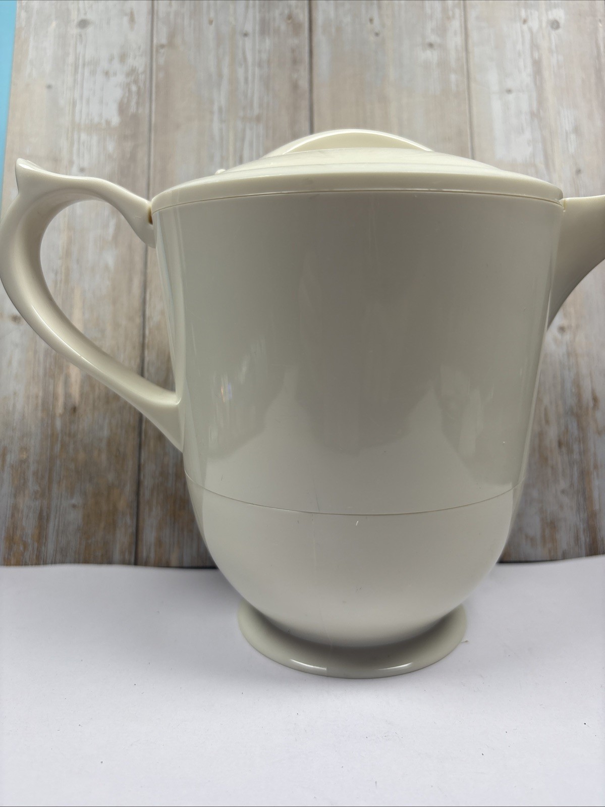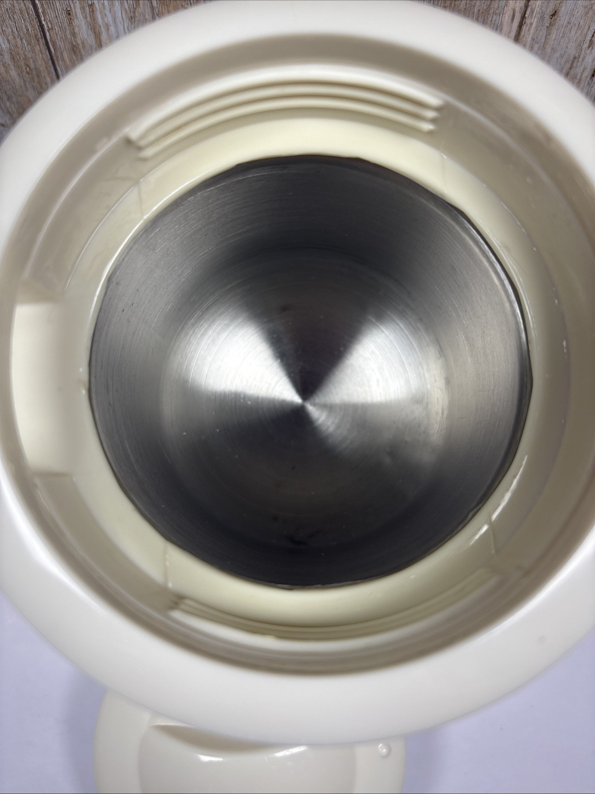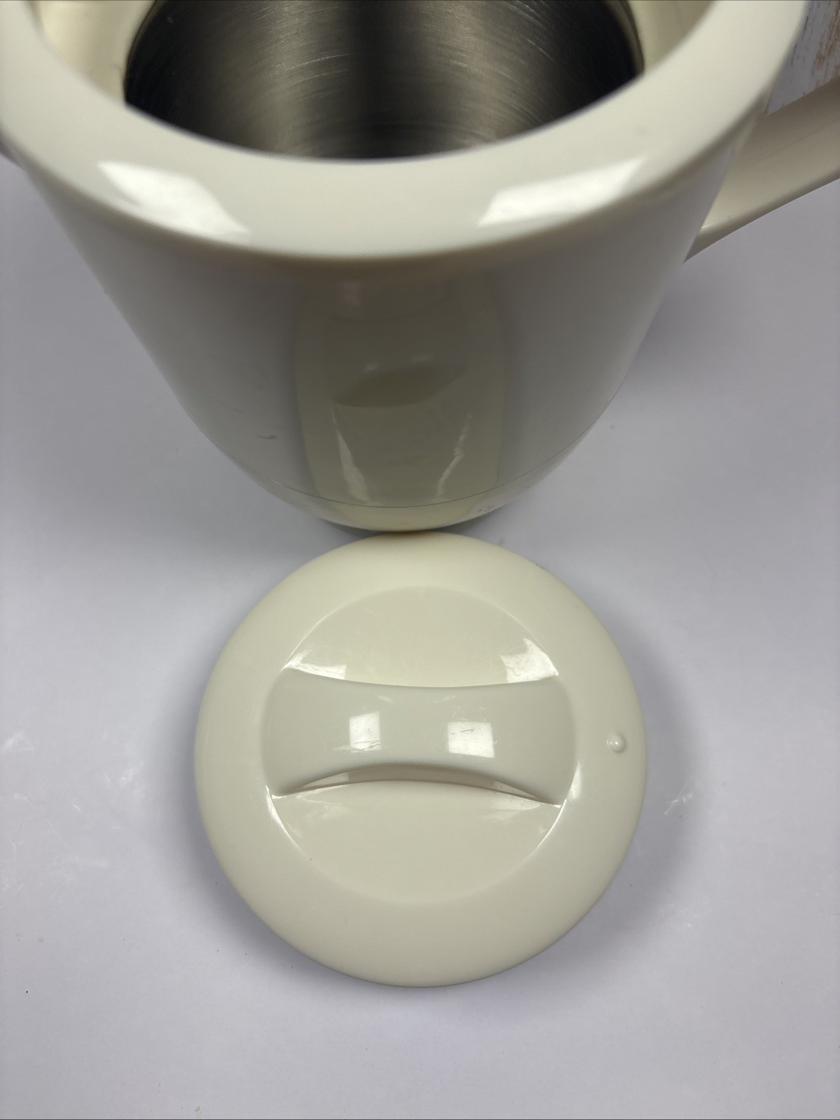 The Thermal Carafe by Oggi Corporation is a vintage-style vacuum hot cold pitcher thermos with a 12oz capacity, perfect for keeping beverages cold. Made of durable plastic in a sleek white color, this pitcher features a twist lid for easy access. Manufactured in China, this product combines style and functionality for your kitchen storage and organization needs. Does have a small discolored spot where it looks like there was maybe a sticker.