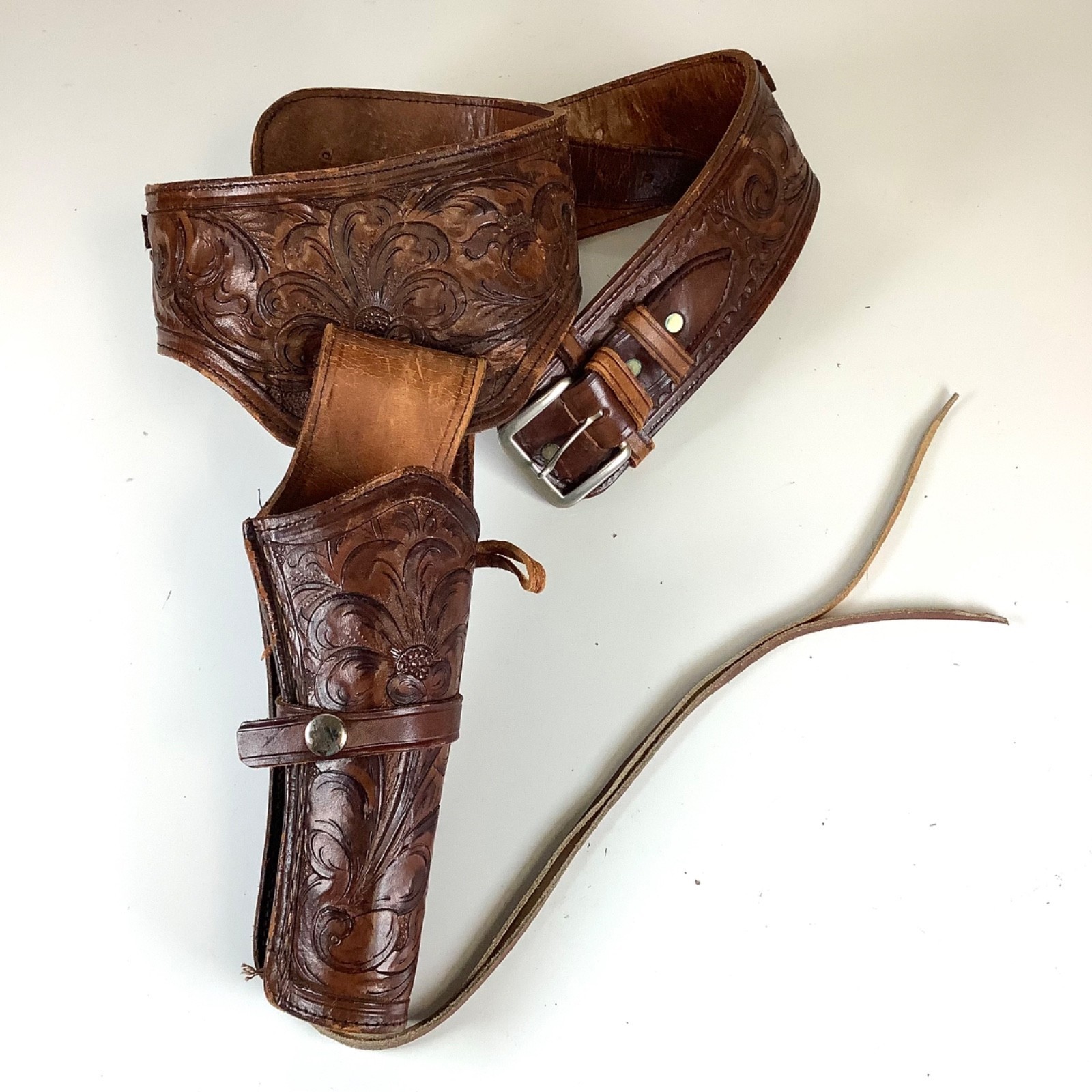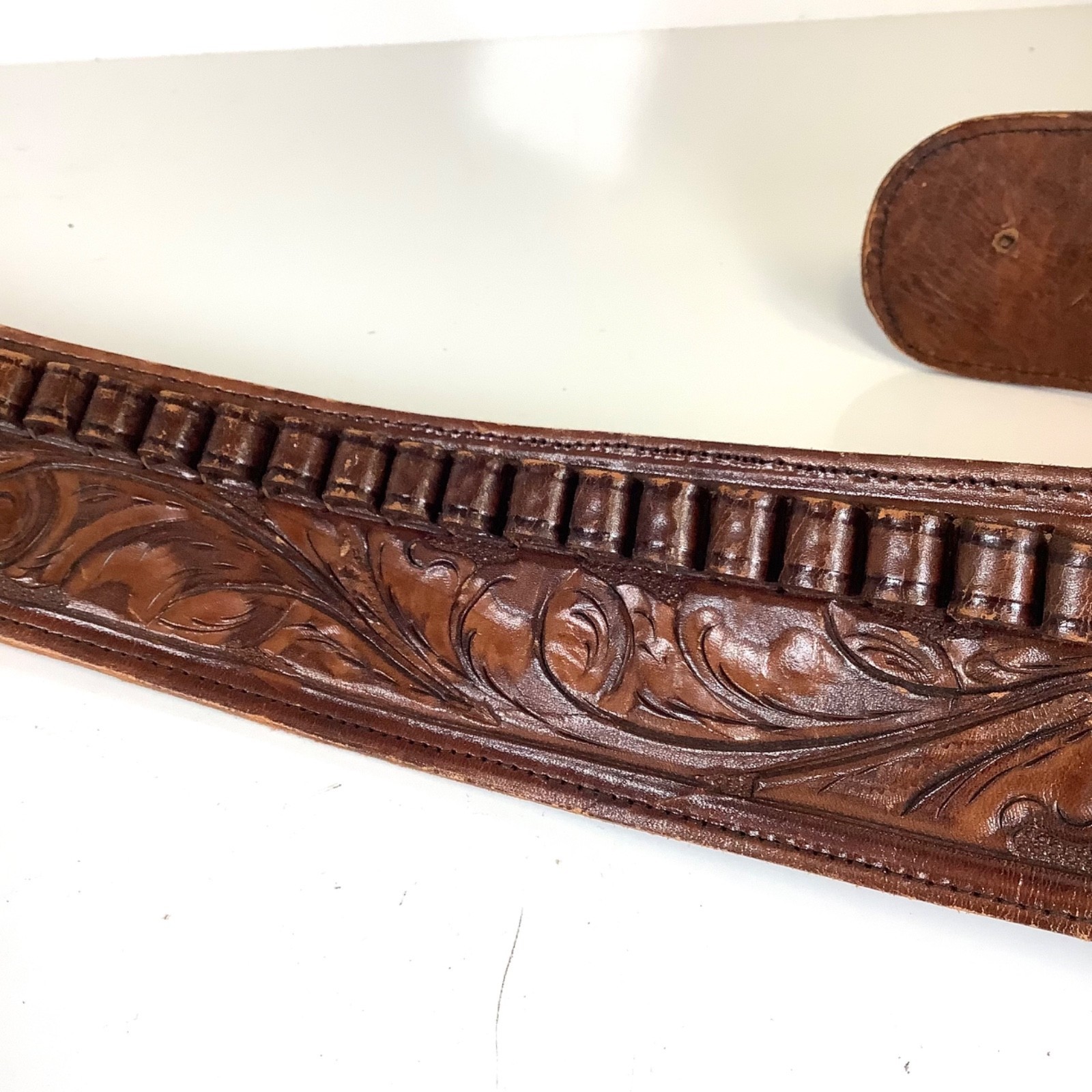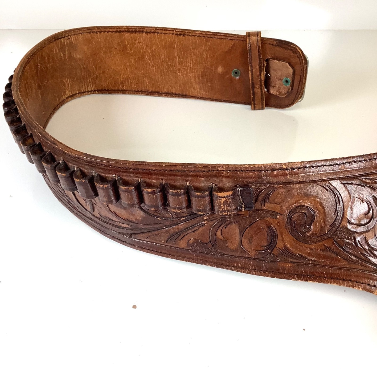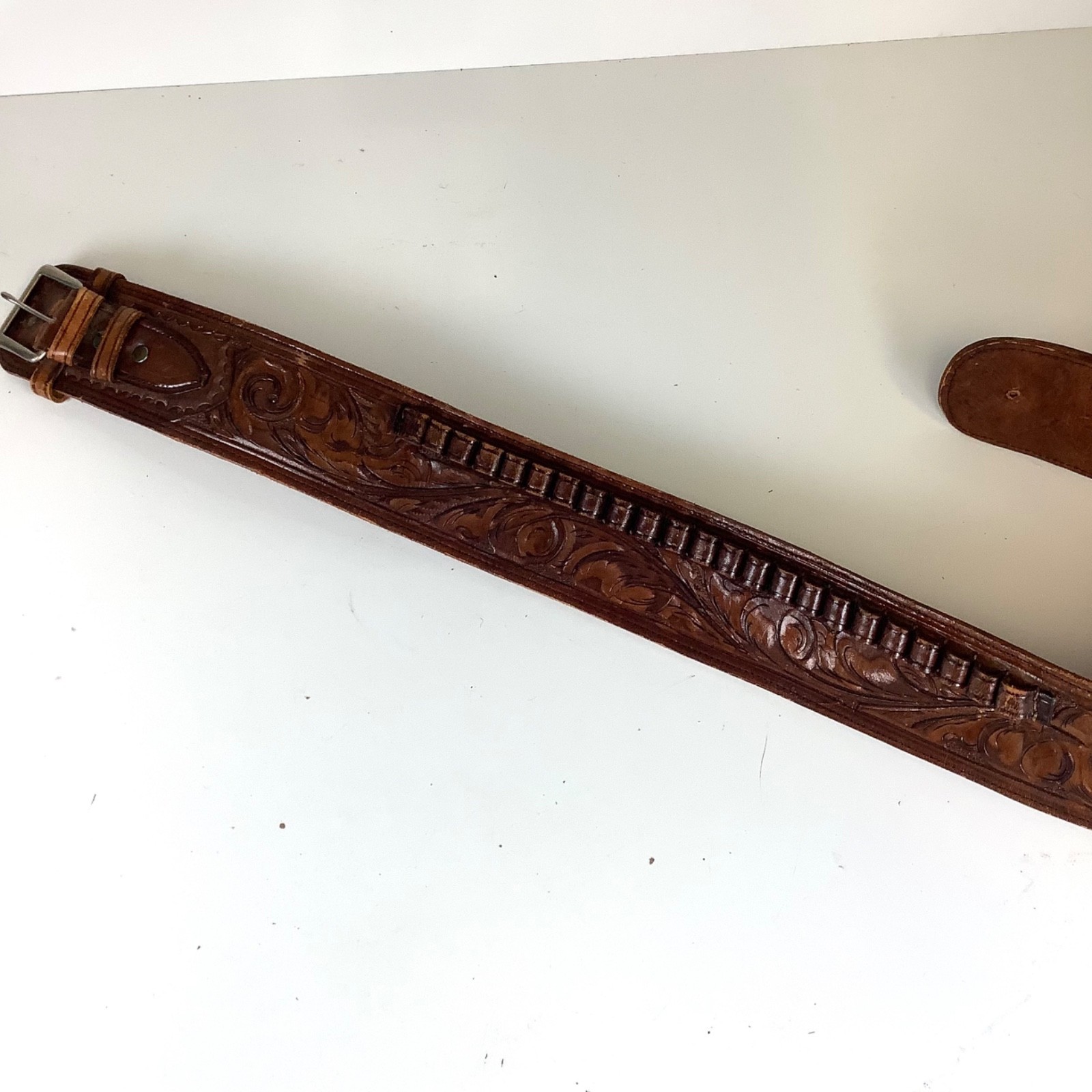 Western Vintage Tooled Leather Gun Holster Belt Ammo Handmade Vaquero Pistol RH. Shows some minor wear but overall good condition. Really nice detail in the tooled leather. Measures approximately 38 inches long when laid out flat. The holster measures approximately 8 inches high and 2 inches wide at the bottom. Please see all photos.