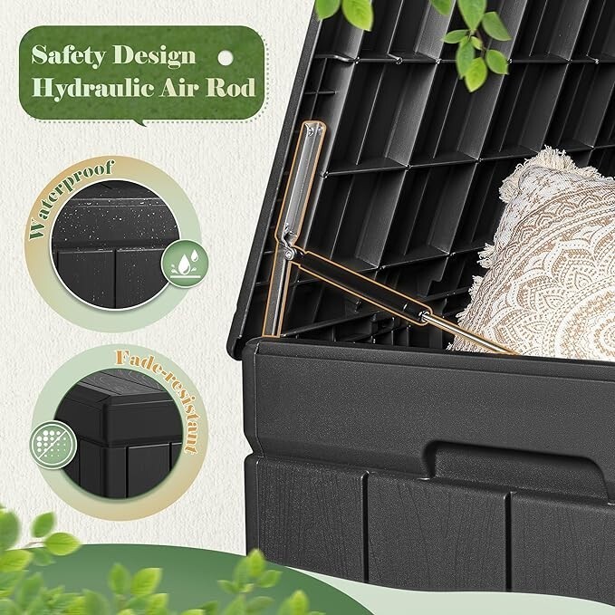 Safe air rod: The deck box is equipped with air rods on the left and right sides for easy opening and closing, and keeping the lid in place. The air rod design can effectively prevent the box in the closure of the pinch your hand.