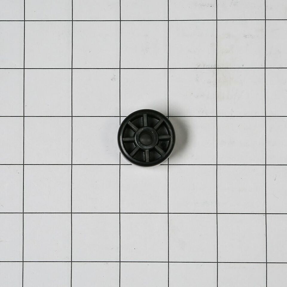 This rear wheel is a little over an inch long. It is all black in color and is made of plastic.