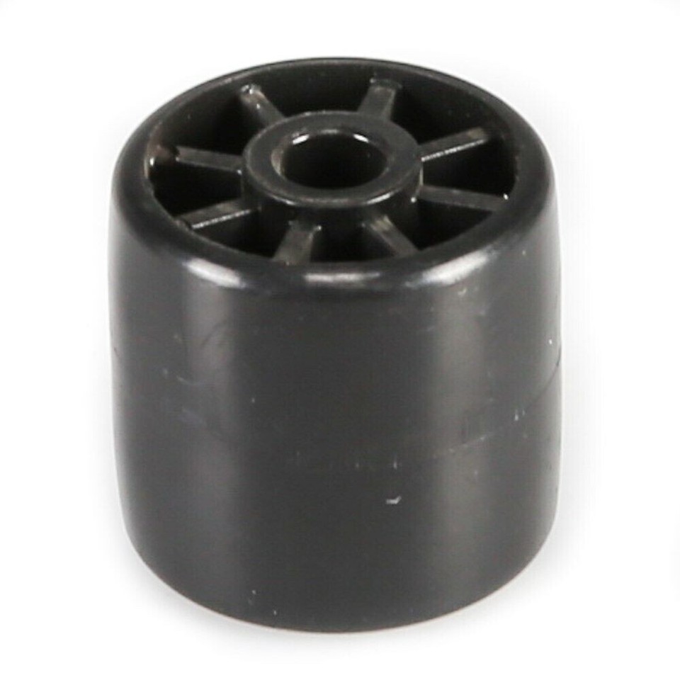 This rear wheel is a little over an inch long. It is all black in color and is made of plastic.