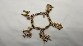 Some Pearls missing from donkey and dog. Please see pics This Pago charm bracelet features five adorable animal charms including a cat, owl, dog, chicken, and donkey. The gold-tone metal bracelet is sure to add a touch of whimsy to any outfit. With its unique and playful design, this bracelet is perfect for anyone who loves animals and wants to show off their fun and quirky side. A great addition to any jewelry collection, this bracelet is sure to bring a smile to your face every time you wear it.