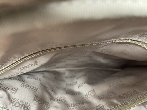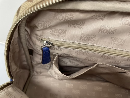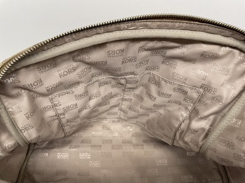 This Michael Kors Signature Dome Satchel Purse is a stylish addition to any woman's collection. The bag features a tan exterior color made of a cotton blend material, giving it a chic and modern look. It comes with a convenient cross body strap, making it easy to carry around on-the-go.