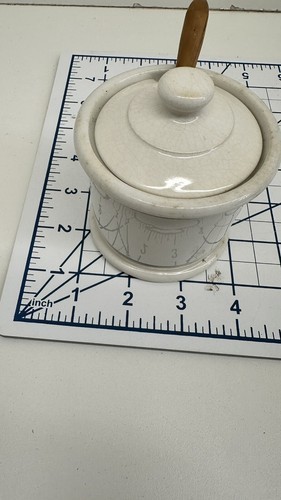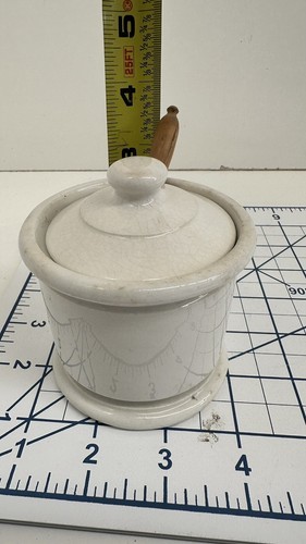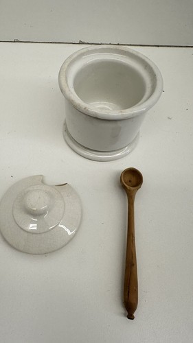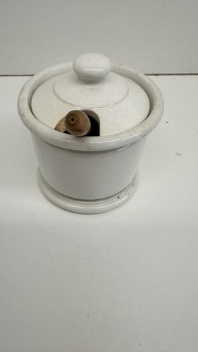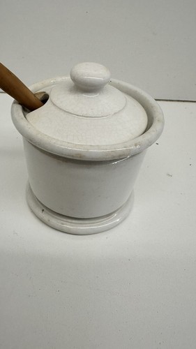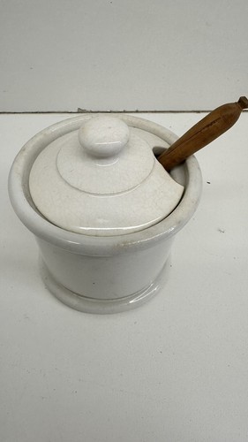 HAS A CHIP IN THE LID. This vintage Homer Laughlin Pottery condiment bowl with wooden spoon is a rare find for collectors of restaurant ware. The bowl features a classic design that is perfect for any kitchen or dining room. Crafted from high-quality materials, this bowl is durable and long-lasting.