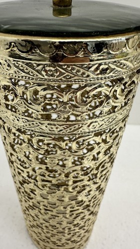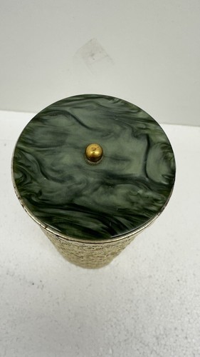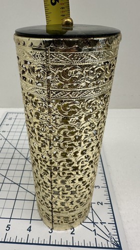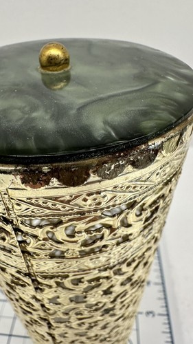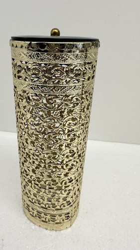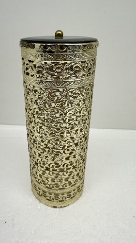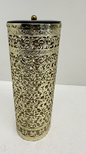 There is some corrosion please review the pics before ordering . Add a touch of glamour to your vanity with this stunning hair spray can cover. The golden metal finish gives it a luxurious look, while the Hollywood Regency style adds a touch of vintage charm. Perfect for storing your favorite hair spray, this cover is a must-have for any beauty enthusiast.