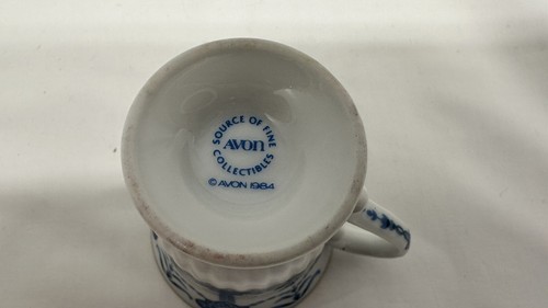 This Avon tea cup from 1984 is a great addition to any collector's set. The blue and white color scheme with gold trim gives it a classic look. This tea cup comes as a set, perfect for enjoying your favorite tea. The brand is well-known for its collectibles, and this piece is no exception. It was manufactured between 1980-1989, making it a timeless piece to add to your collection.