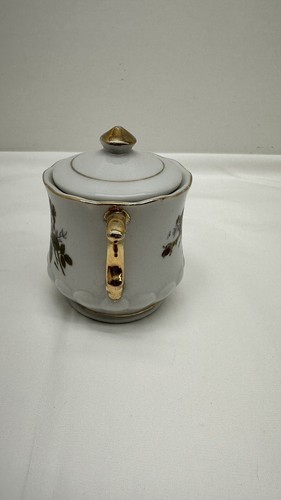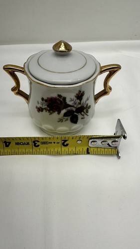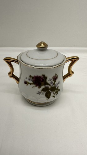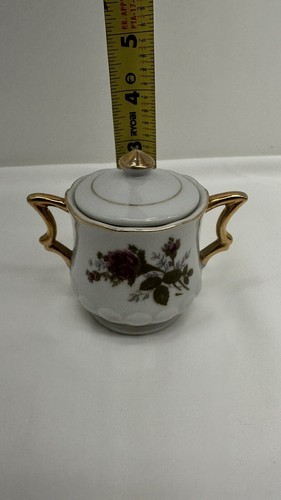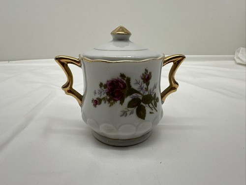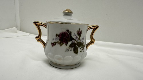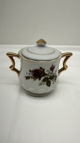 Vintage Small Porcelain Sugar Bowl w/Lid Rose Pattern w/Gold Tone Trim