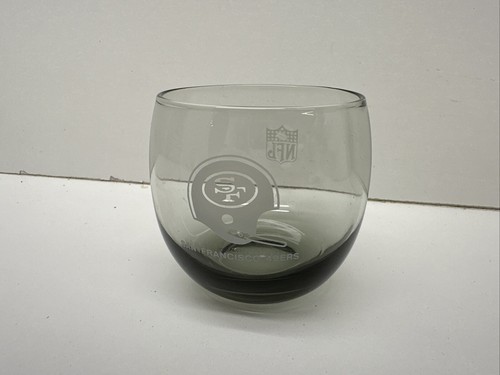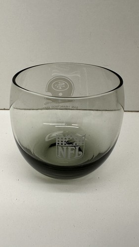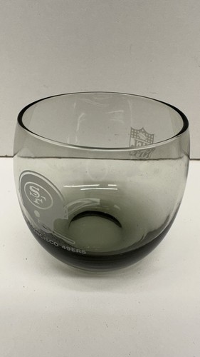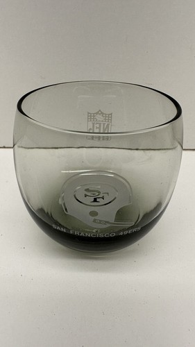 This vintage low ball glass is a must-have for any San Francisco 49ers fan. The stemless design and smoked gray color make it a stylish addition to any collection. Made of glass and featuring a rocking glass, this original piece from the 1970s is perfect for all occasions. The glass is labeled with the iconic 49ers logo, making it a great gift for any fan of the team. Whether you're sipping on a drink or displaying it in your home, this glass is sure to impress.