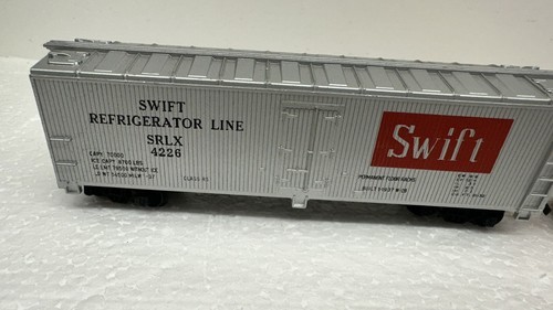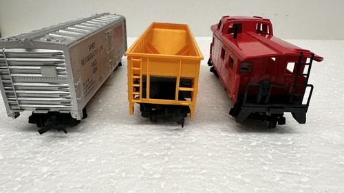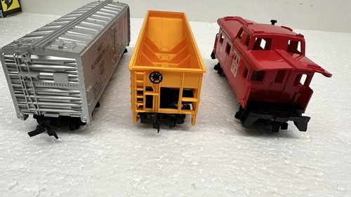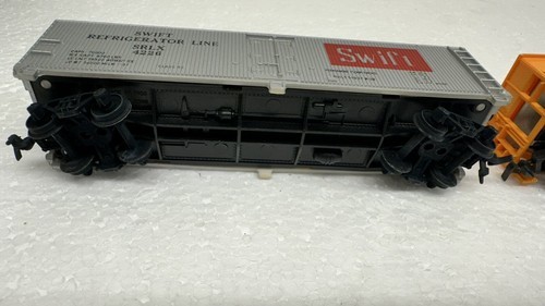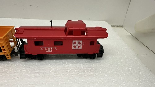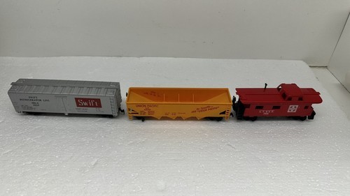 The caboose is mining its couplers. This vintage Tyco HO train car set includes a Union Pacific hopper, Swift Freight caboose, and an AT SF caboose. The colorful multicolor design and intricate details make this a great addition to any model railroad enthusiast's collection. The caboose is pre-built and ready to go, and the plastic and steel materials ensure durability. This replica of the Santa Fe caboose is a must-have for any fan of the Union Pacific Railroad. Add this unique and fun piece to your collection today!