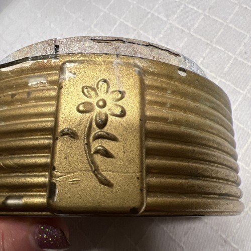 This Art Deco powder box features a combination of glass and pewter metal in its design. The lid is adorned with a Victorian portrait and a mirror, adding a touch of elegance and sophistication. The mirrored lid not only adds a practical element to the powder box but also enhances its aesthetic appeal, making it a stylish addition to any vanity or dressing table.