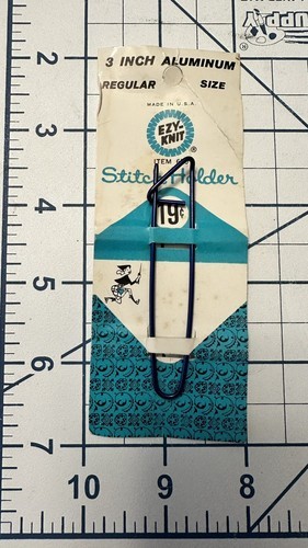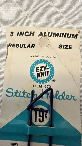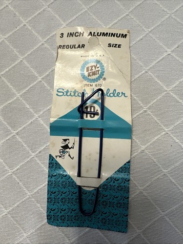The product is an EZY KNIT 3-inch vintage aluminum stitch holder in black color, model number #670. This stitch holder is designed to assist with holding stitches in place while working on knitting projects. Made of durable aluminum, it provides a lightweight yet sturdy solution for keeping stitches secure when not in use. Perfect for knitters looking for a reliable tool to help with their projects, the EZY KNIT stitch holder offers convenience and ease of use.