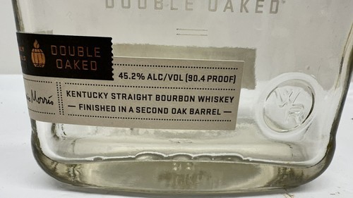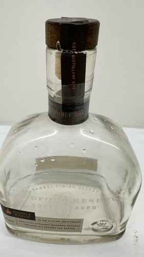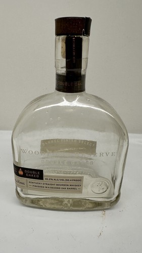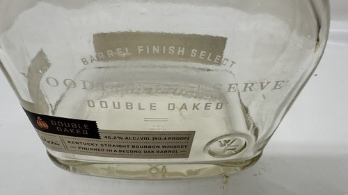The product is an empty bottle of Woodford Reserve Double Oaked Kentucky Straight Bourbon Whiskey. It is a 750 ml liquor bottle with a clear color, featuring a modern design manufactured in the United States. The bottle type is specifically for liquor, and it is not a modified item. This collectible piece is likely sought after by enthusiasts of bourbon whiskey or collectors of unique liquor bottles due to its distinctive branding and design.