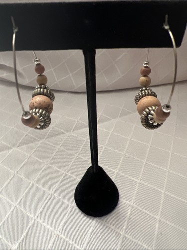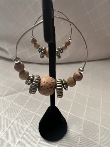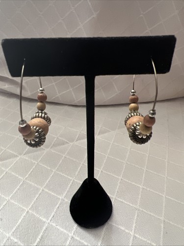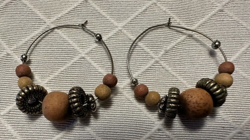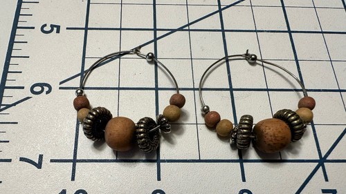 Multicolor Wood + Silver Beaded Hoop Earrings Silver Tone Boho Chic