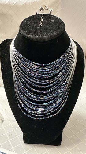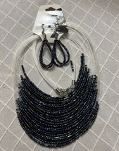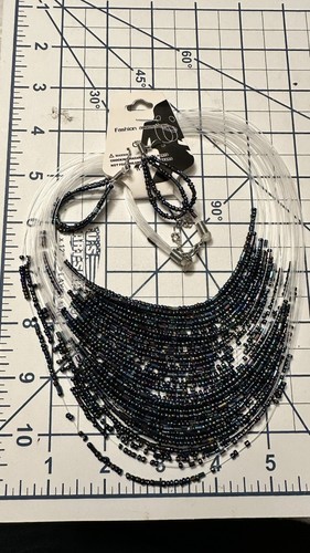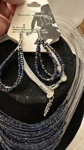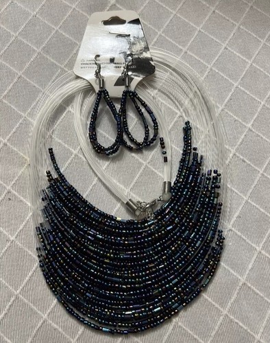 This necklace and earring set features multi-colored beads strung on strong plastic line. The design suggests a vibrant and eclectic style, perfect for adding a pop of color to any outfit. The set is versatile and can be worn for casual or more formal occasions, making it a fun and fashionable accessory to have in your collection.