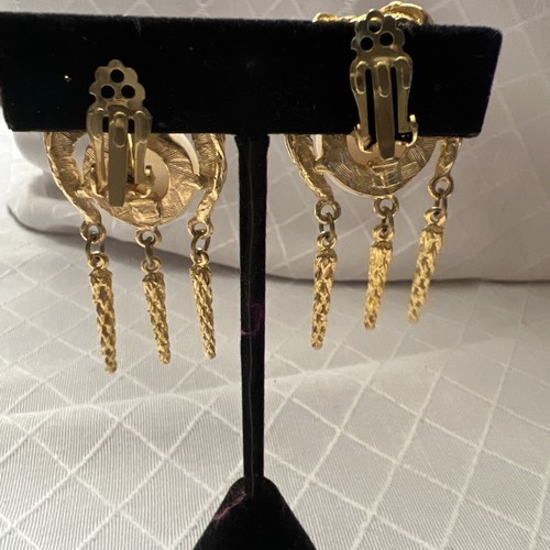 These vintage clip-on earrings feature a goldtone design with white faux pearl accents, giving them an elegant and classic look. The closure is clip-on style, making them easy to wear without the need for pierced ears. The earrings are signed, indicating their authenticity, and are of United States origin. With a vintage charm and timeless style, these earrings are a beautiful addition to any jewelry collection.