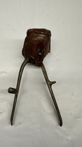 The item is an antique clipper set that includes a leather case and a stamped shaver. This antique vanity collectible is likely a grooming tool used for shaving purposes. The presence of a leather case suggests that the set was meant for storage and possibly for travel, adding to its aesthetic and functional appeal as a piece of history.
