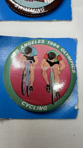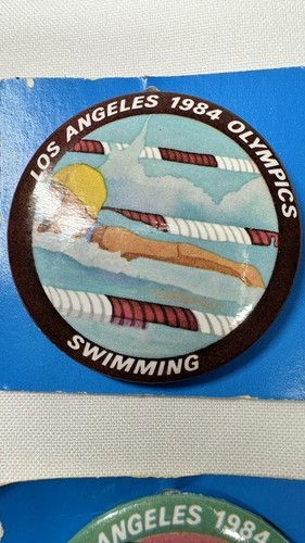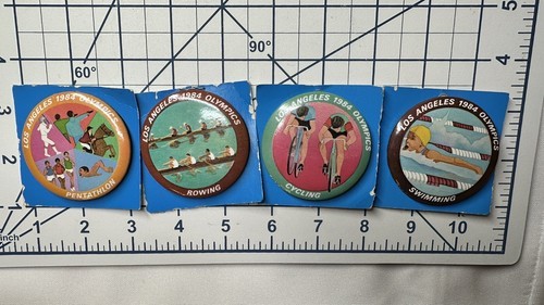 Lot of 4 Show your love for the 1984 Los Angeles Olympics with these vintage 2" buttons featuring swimming, cycling, rowing, and pentathlon. These unisex adult pins are perfect for any fan of sports memorabilia. The multicolor design makes them a great addition to any collection, and the Los Angeles Angels team spirit is sure to make them a hit with any fan.