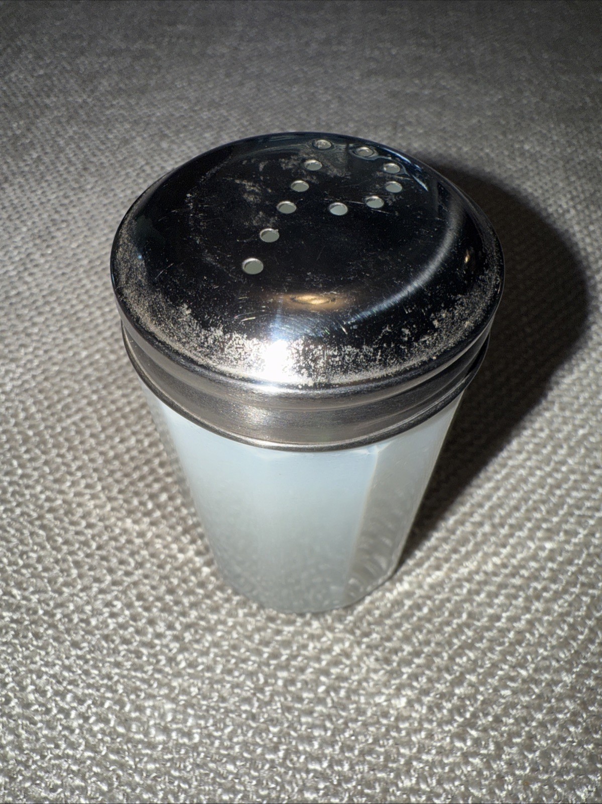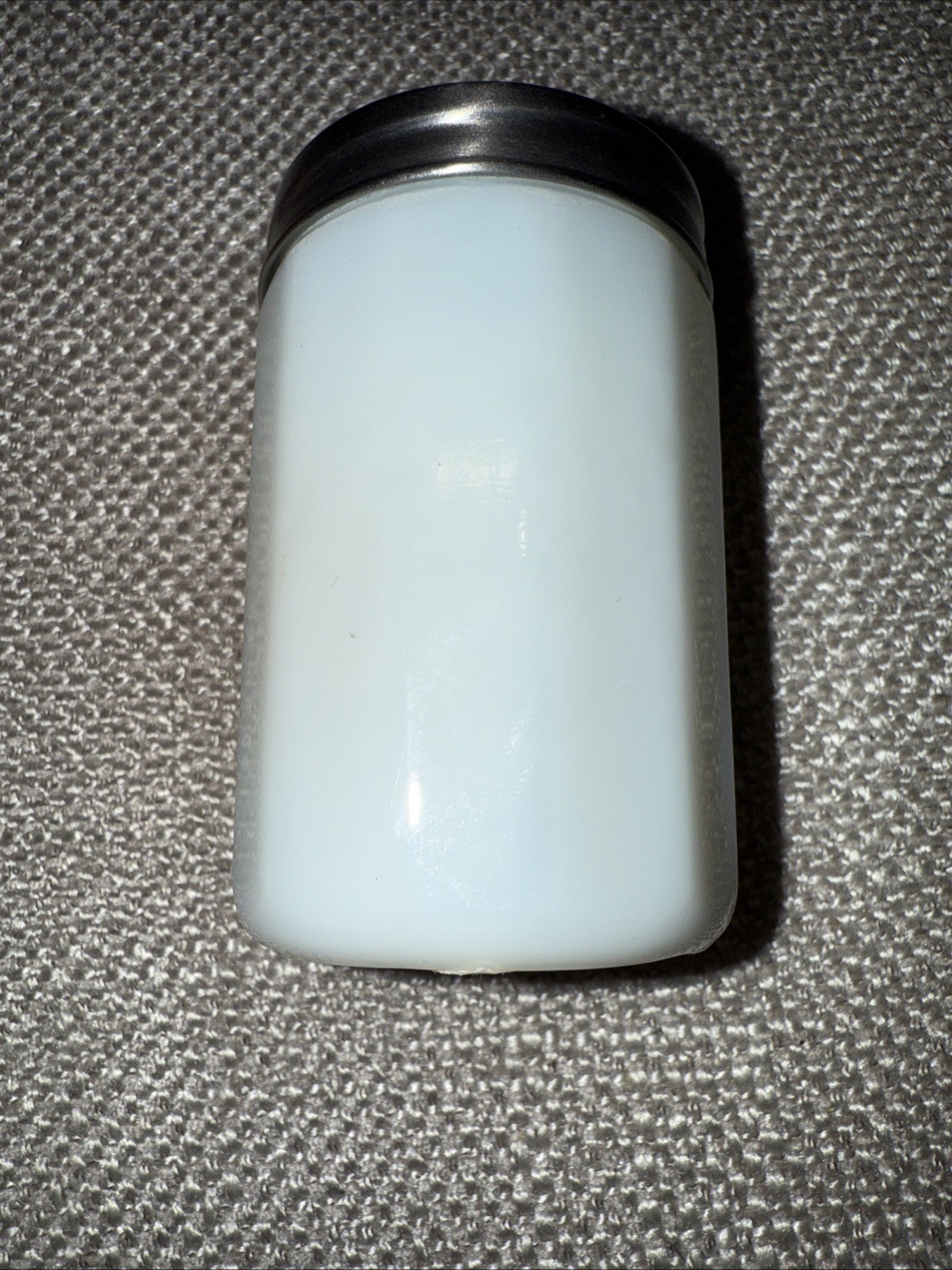 Milk, Glass Vintage style pepper shaker Metal P Lid 3x2”. NEW