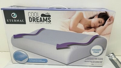 The Eternal cool Dreams Ergonomic Cooling Memory Foam Pillow is a medium 19.5?x12?x4?inch pillow filled with gel foam for added comfort and support. The cooling feature of this pillow makes it perfect for use in a bedroom, providing a refreshing feel during the night. Its ergonomic design and memory foam material ensure a customized fit for a restful night's sleep. Ideal for those looking for a cooling and supportive pillow to enhance their bedtime routine.