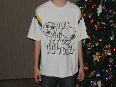 Size M but really oversized so please refer to all the measurements: Armpit to Armpit : 24" Length in back middle without the collar : 29" For Reference : My son is wearing a size XS in the picture but would usually be a size Medium. As you can see it is still loose. Limited-edition collaboration with a classic sporty vibe Lived-in, vintage wash Ultra-soft jersey Snoopy playing soccer Football jersey styling and stripe detailing