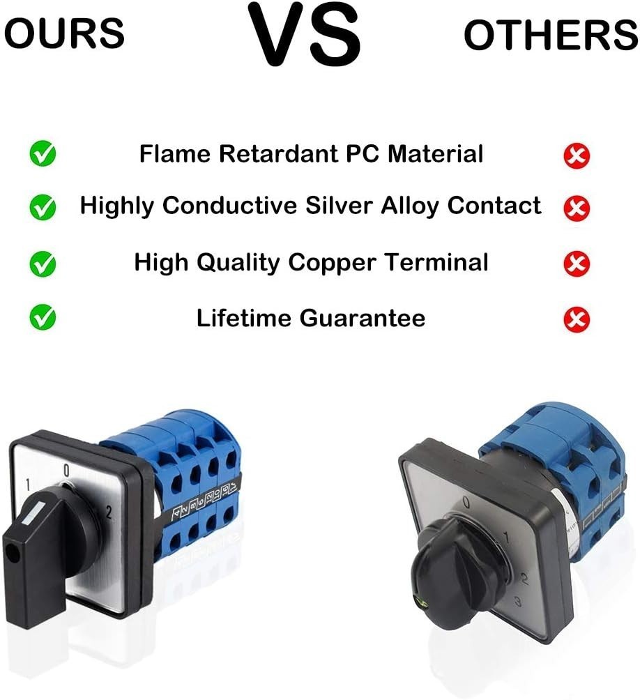 This high-quality changeover switch features a flame retardant PC body with excellent insulation and high-temperature resistance. Its flexible handle and rotary selector allow for easy operation, while the durable copper parts with silver alloy points ensure strong thermal conductivity and longevity. Suitable for electrical wiring in power switches, speed switches, and induction motors, it supports versatile control circuit conversions. The model LW28-20 D404.4 boasts 3 positions (1-0-2), 16 terminals, and a latching type action rated at 550V and 20A. Easy to install on mounting boards between 1mm to 5mm thick, it includes one switch and four mounting screws. Perfect for motor control, circuit switching, and automation applications. Customer satisfaction remains our top priority. To ensure fast and reliable delivery, we work with multiple fulfillment partners and suppliers. Depending on availability and location, your order may ship from different warehouses or arrive in packaging that varies from item to item. Tracking details are typically provided shortly after shipment, and customer satisfaction remains our top priority. Please note that due to carrier policies and regional regulations, certain items may not be eligible for delivery to specific states or territories.