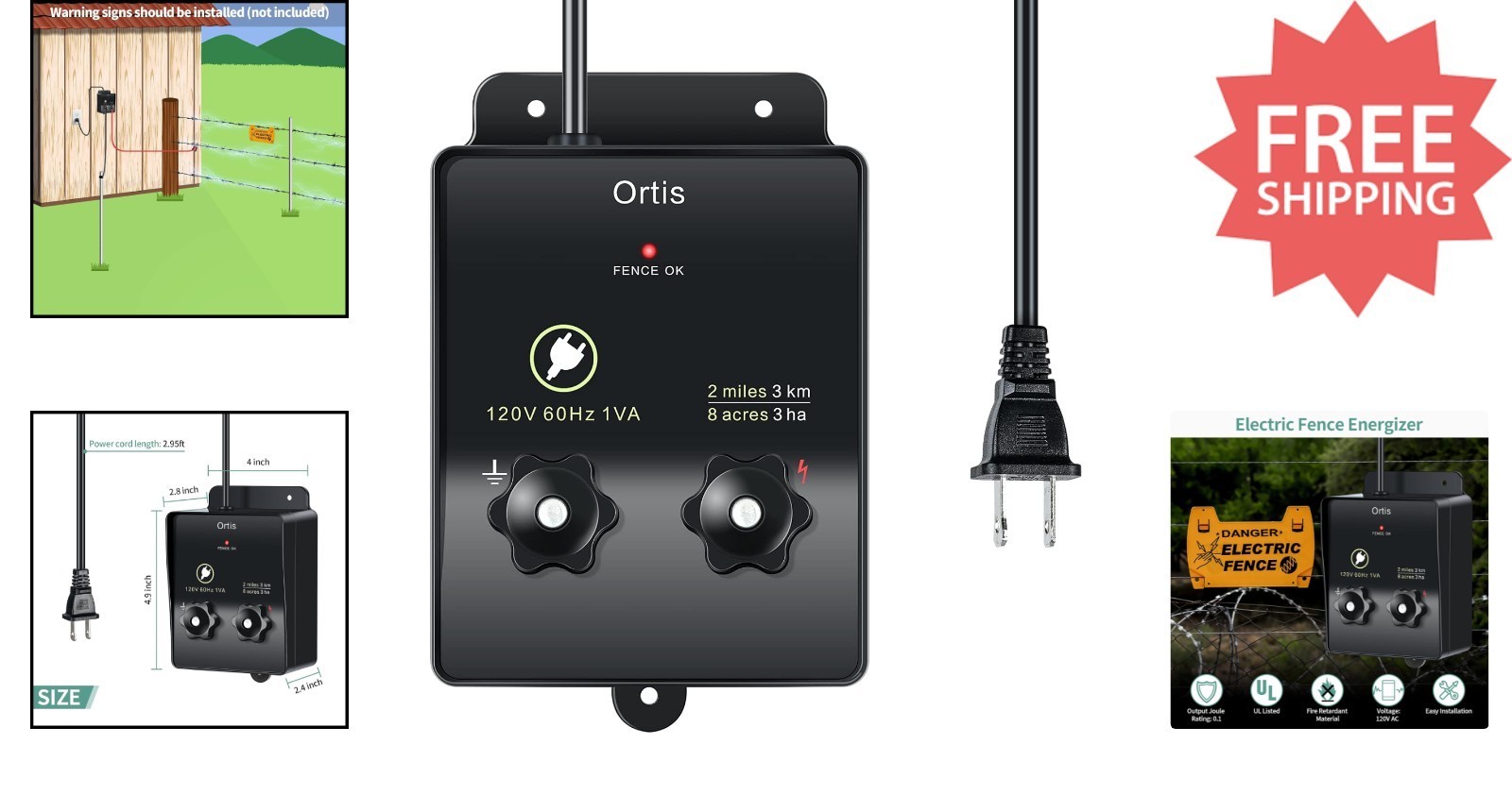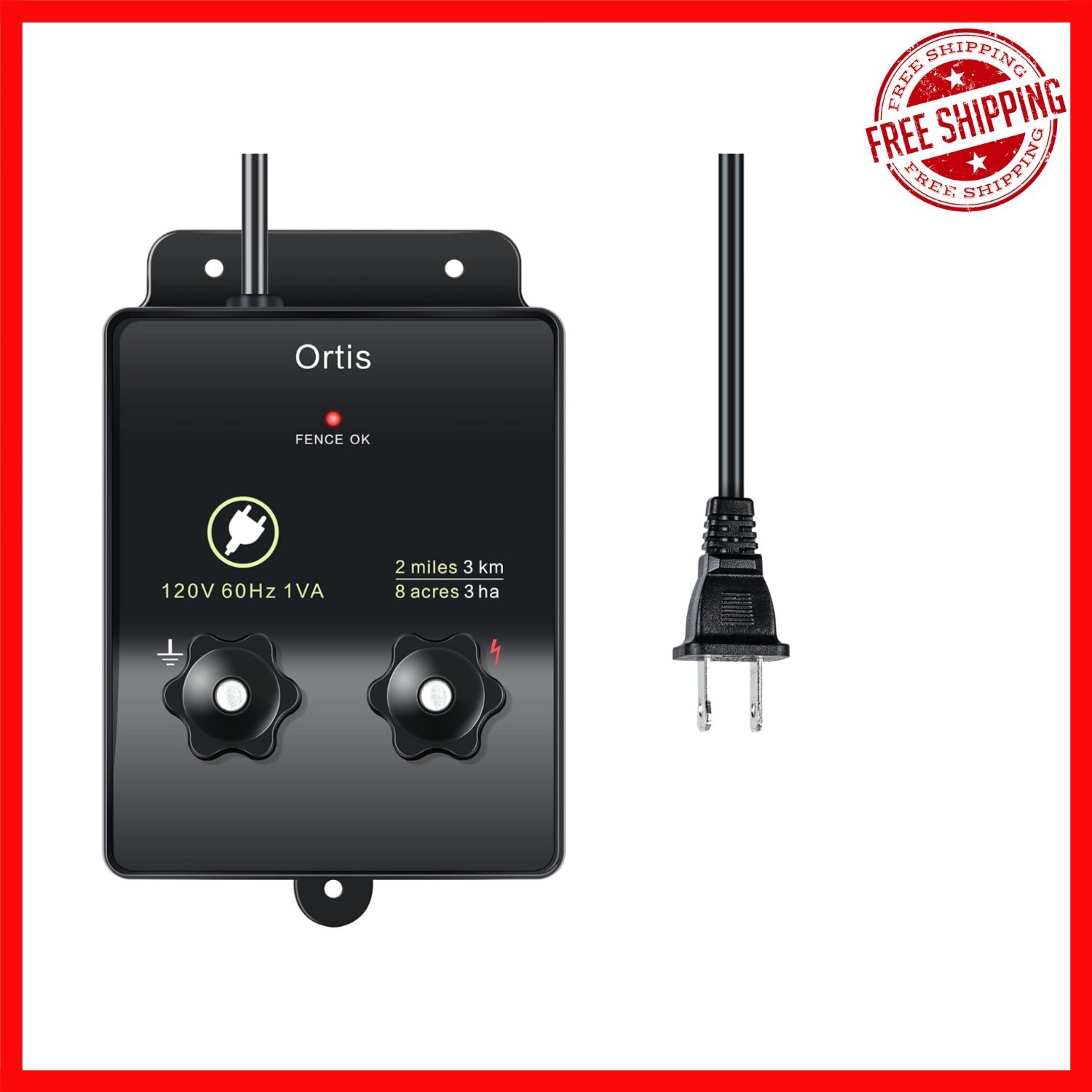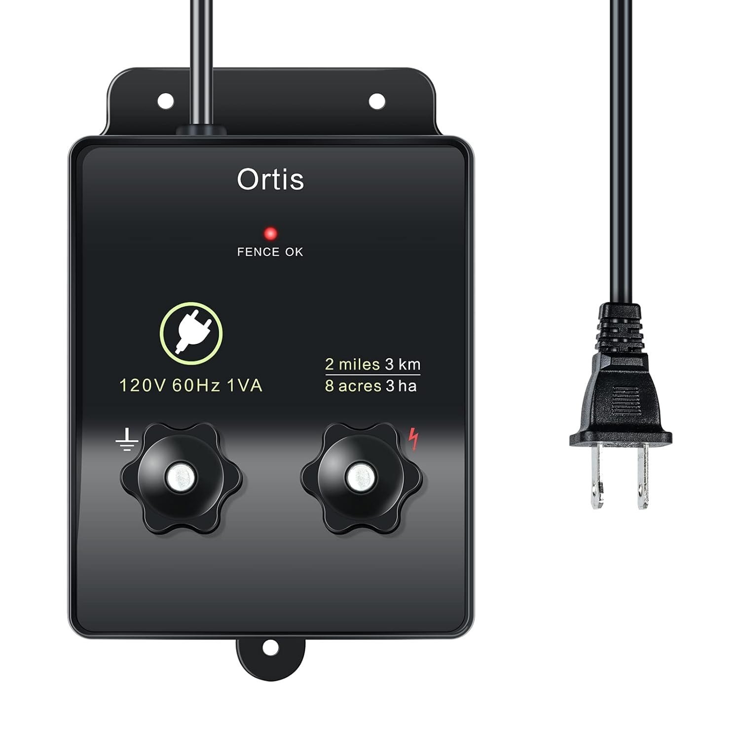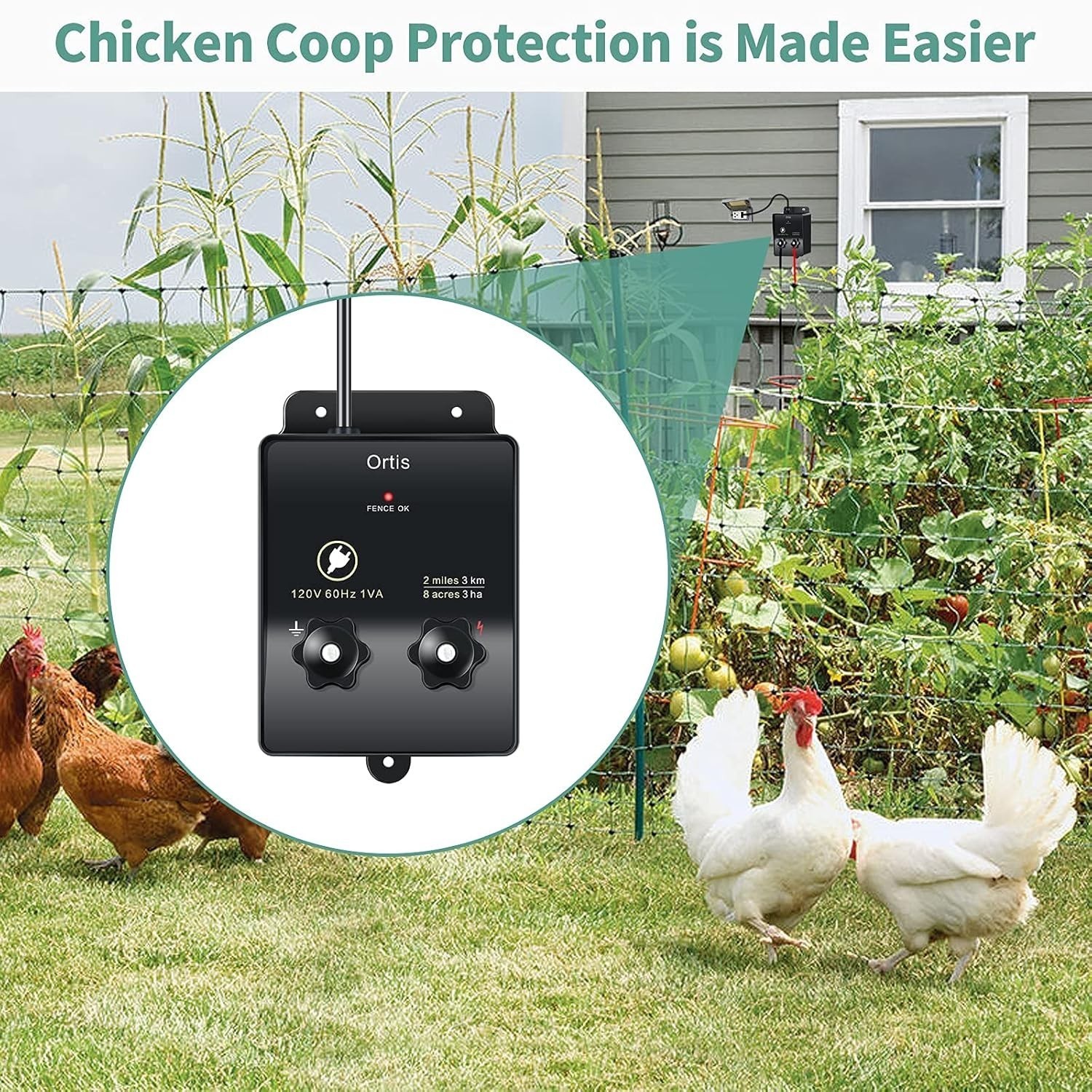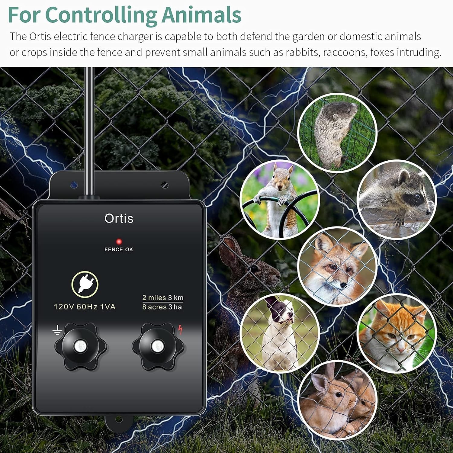 The Ortis Electric Fence Charger is an efficient solution for safeguarding your property and livestock. Designed to energize up to 2 miles of fencing and cover approximately 8 acres, it is compatible with diverse soil types. With a safe 5000V output and pulsating technology, it effectively discourages small animals and intruders without causing harm. Easy to install with screw-on terminal knobs, it ensures quick setup?perfect for protecting your garden, chickens, and domestic animals. Its flame-retardant shell and listing guarantee safety and durability. For outdoor use, a waterproof cover is recommended.