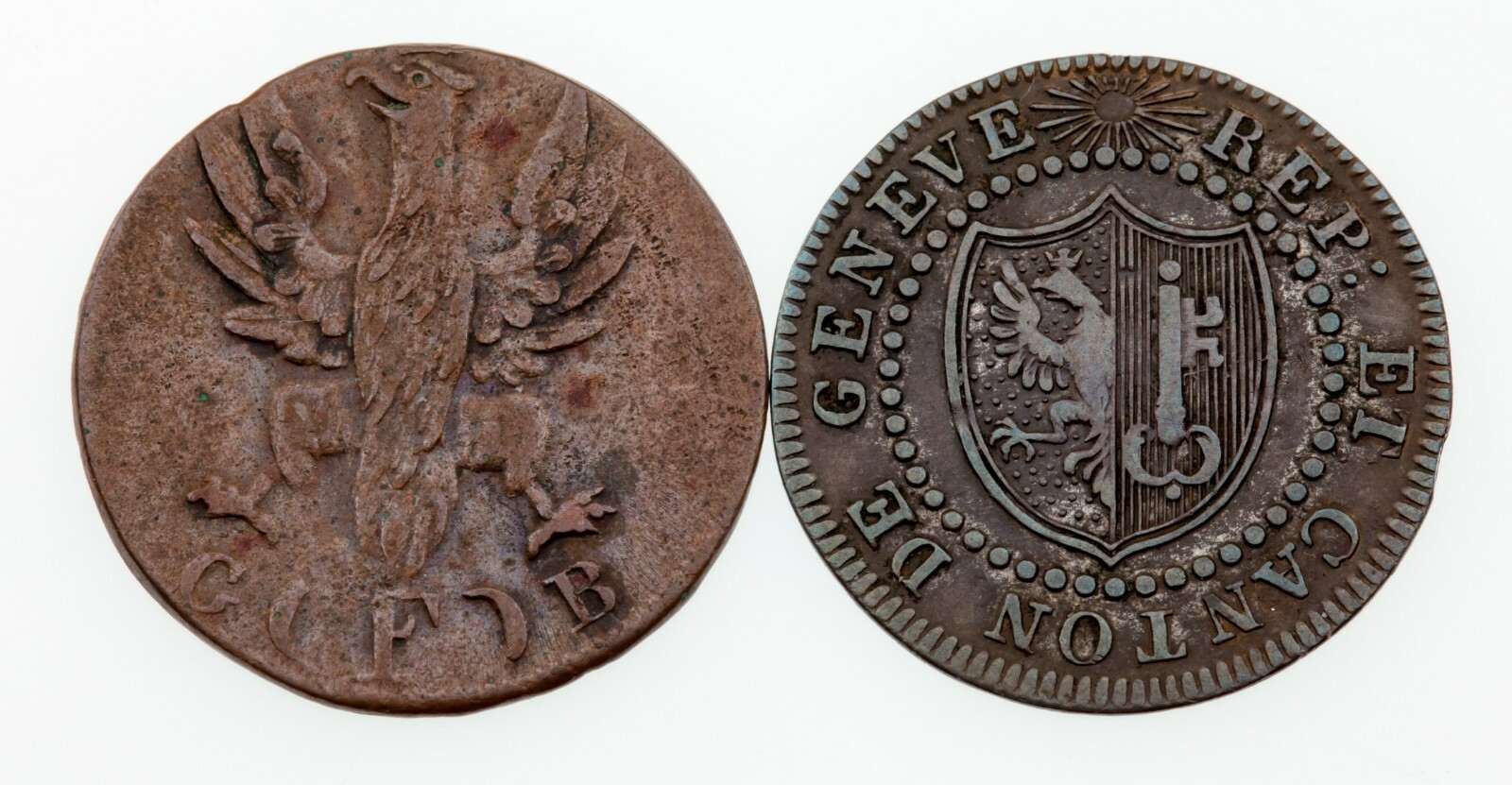 Lot of 2 Coins 1821 German States Frankfurt Heller and 1817-H Geneva 1 Sol VF-XF
