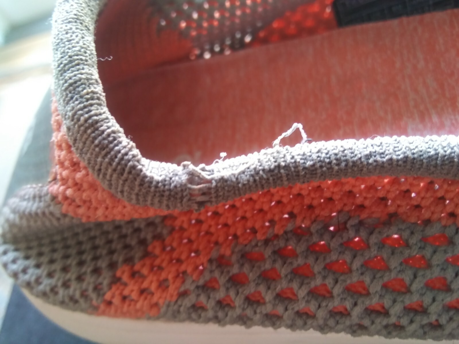WITH ONE LOOSE CONFINED STITCH ON RIGHT SHOE