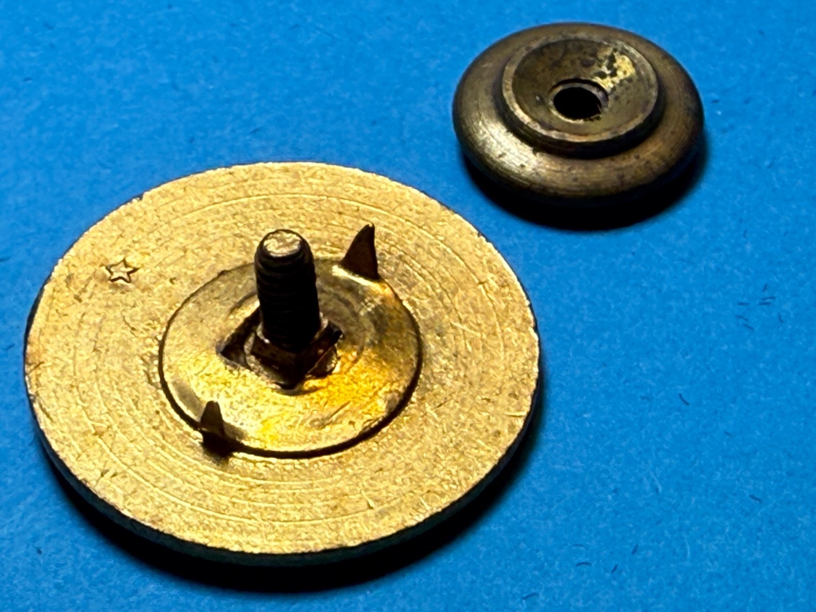 Thumb screw is intact. Measures approx. one inch in diameter. Screw back.