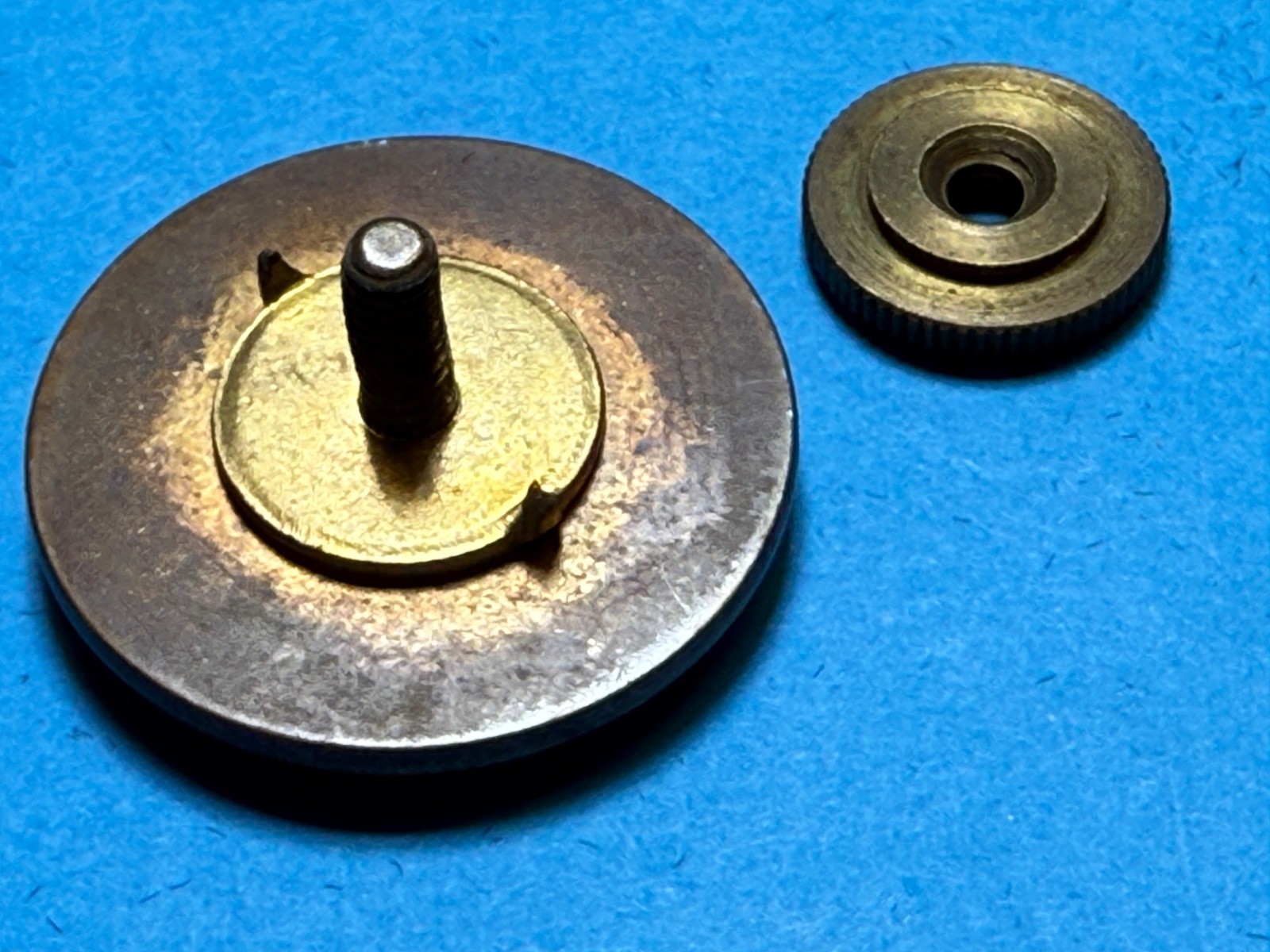 In 1937 the Army adopted a new type of disk that differed from the Type I and II in that the disk was two piece. It had a plain blight brass finish with a small square hole in the center. The device of the service branch or the letters U.S. were a separate piece that had the screw post in its back and fit into the hole in the disk. A separate piece screwed on the back held the disk and branch device together and the entire assembly was attached to the uniform with a screw nut. Type III disks were mass produced in the early years of World War Two and are common on period uniforms. Their production was discontinued during the war because they used a fair amount of brass, which was a strategic material. William K. Emerson called type of Type III disk adopted in 1937 a Type IIIa to distinguish it from the more recent two piece disk that I call a "Neo-Type III" and he calls a Type IIIc.