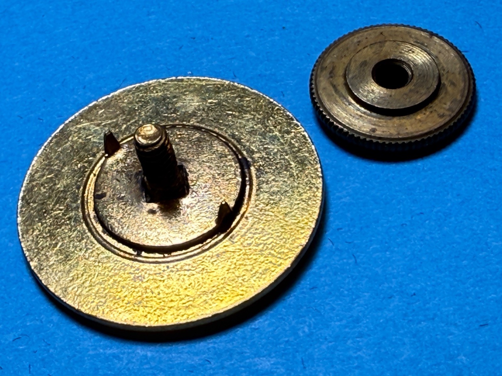 Thumb screw is intact. Measures approx. one inch in diameter. Screw back.