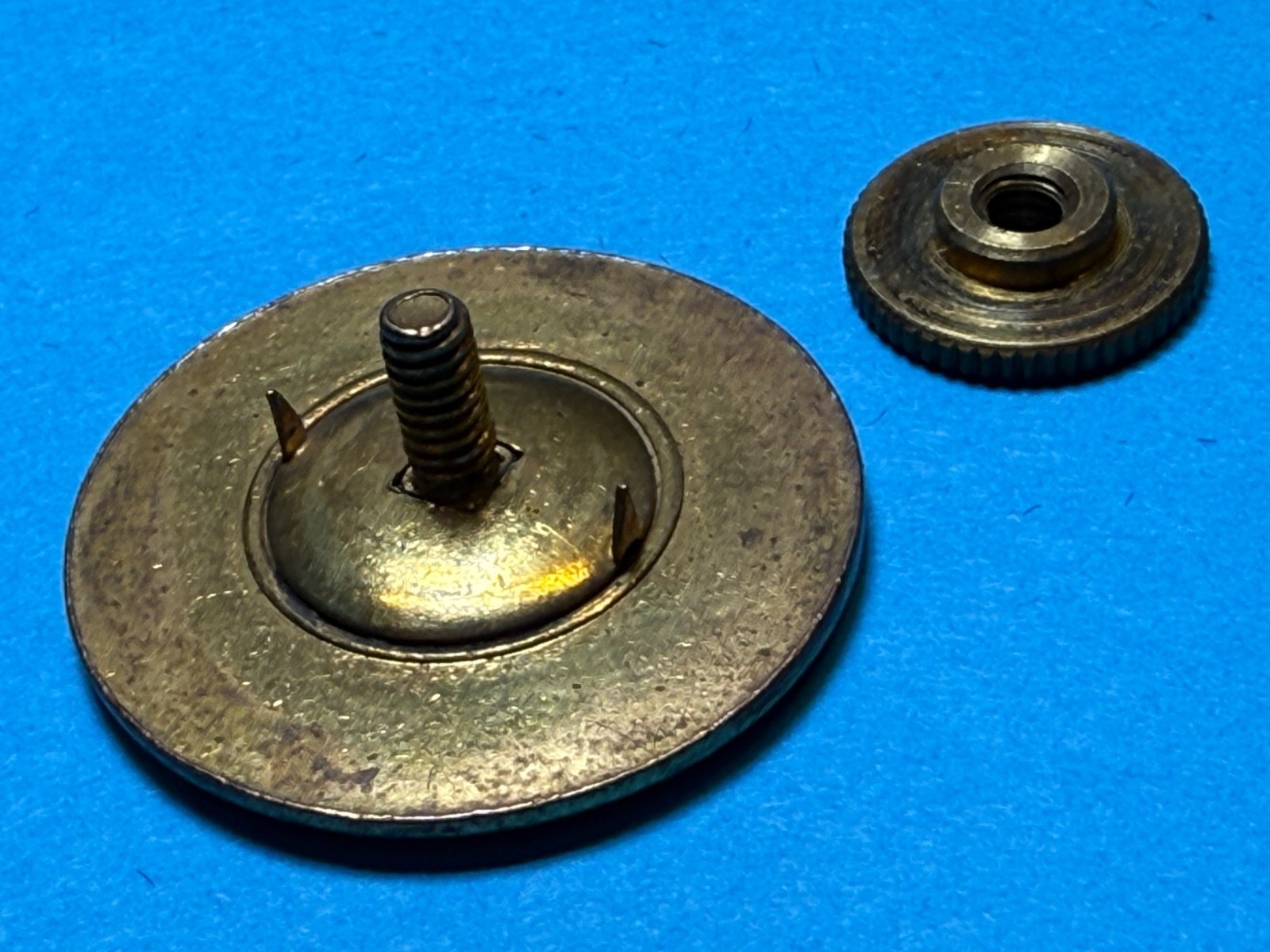Thumb screw is intact. Measures approx. one inch in diameter. Screw back.