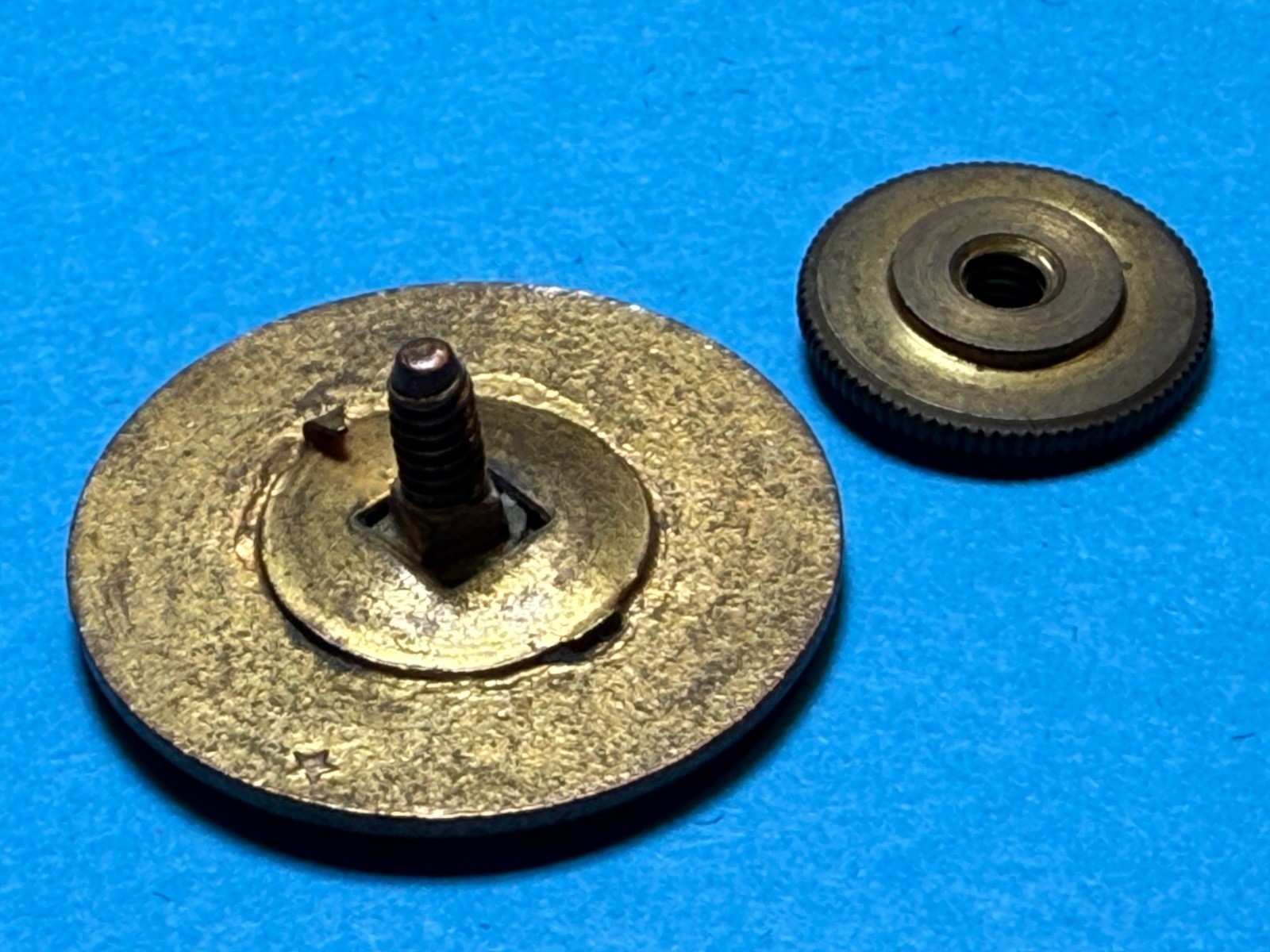Thumb screw is intact. Measures approx. one inch in diameter. Screw back.