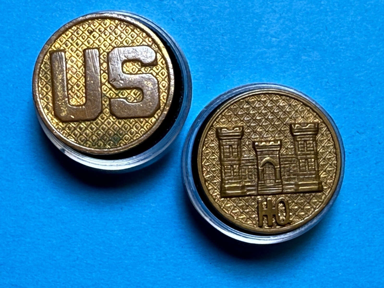 Grouping consists of a U.S. Collar Disk and an Headquarters, Engineers, Collar Disk, Both are Type II, Enlisted. Both thumb screws are intact. Measures approx. one inch in diameter. Screw backs. The Engineer Collar Disk has an applied letters "HQ"