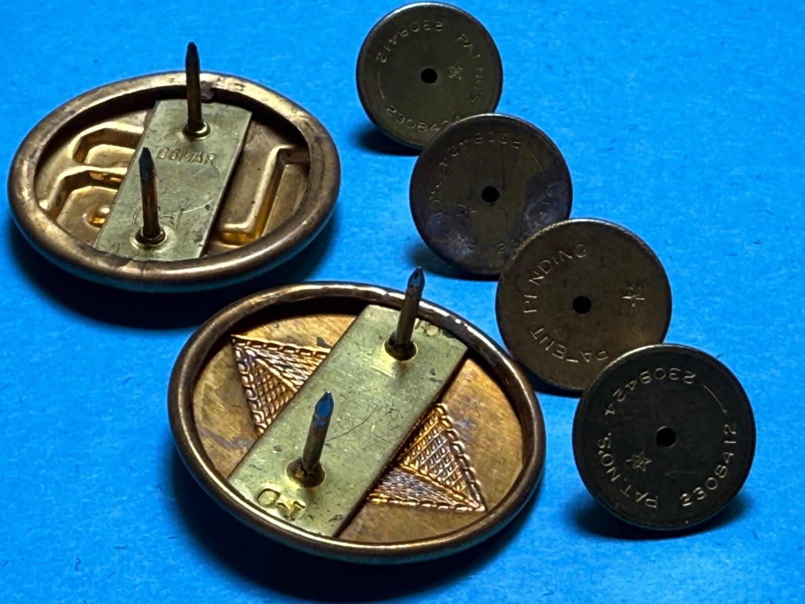 These are one piece, brass, stamped construction, leaving a reversed image on the back. The clutch posts are supported by a steel or zinc insert in the back of the insignia. Vintage WWII clutches included.