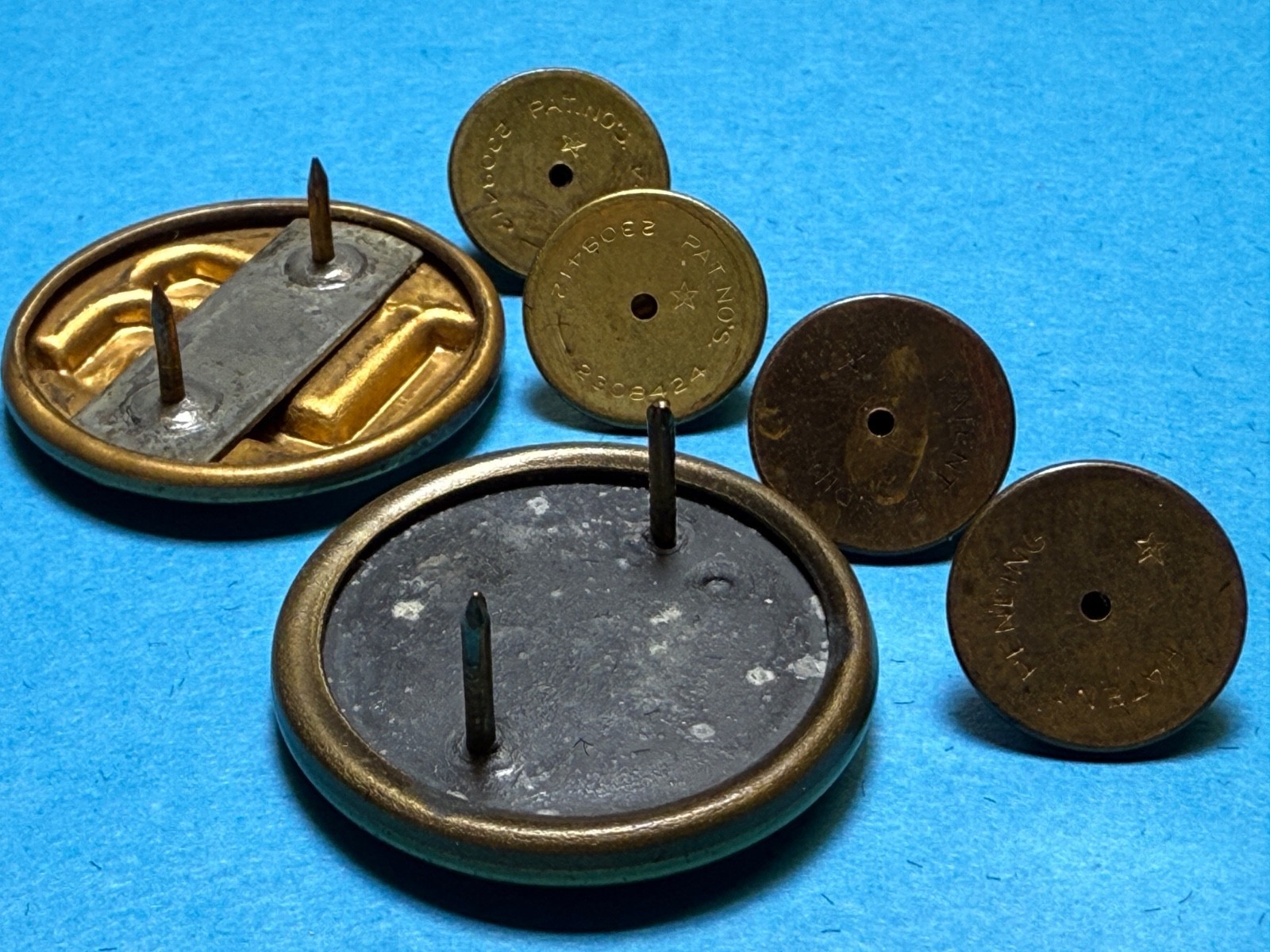 These are one piece, brass, stamped construction, leaving a reversed image on the back. The clutch posts are supported by a steel or zinc insert in the back of the insignia. Vintage WWII clutches included.